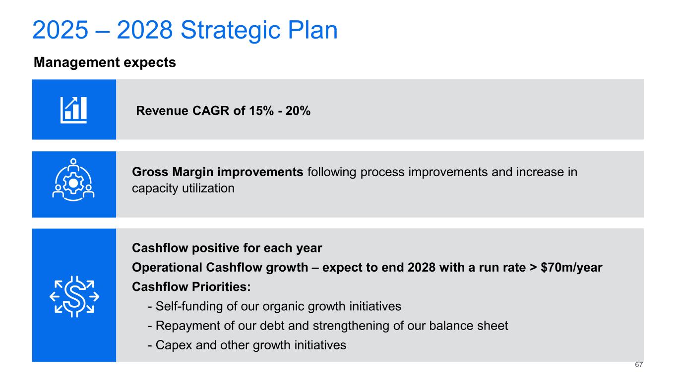 Revenue CAGR of 15% - 20% Gross Margin improvements following process improvements and increase in  capacity utilization Cashflow positive for each year Operational Cashflow growth – expect to end 2028 with a run rate > $70m/year Cashflow Priorities: - Self-funding of our organic growth initiatives - Repayment of our debt and strengthening of our balance sheet - Capex and other growth initiatives 2025 – 2028 Strategic Plan Management expects 67