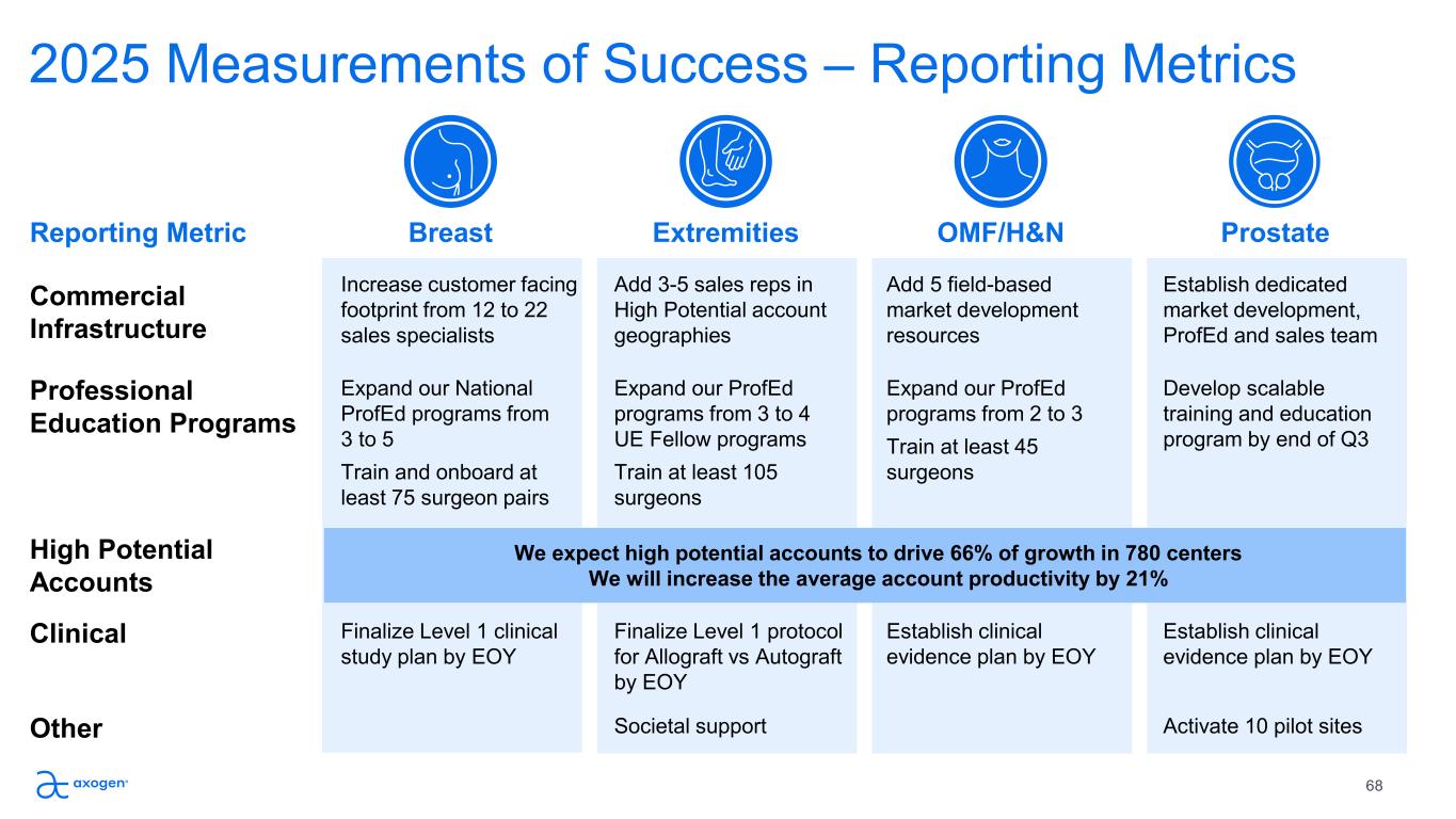 Breast Increase customer facing  footprint from 12 to 22  sales specialists Expand our National  ProfEd programs from  3 to 5 Train and onboard at  least 75 surgeon pairs Finalize Level 1 clinical  study plan by EOY  OMF/H&N Add 5 field-based  market development  resources Establish clinical  evidence plan by EOY  Expand our ProfEd  programs from 2 to 3 Train at least 45  surgeons Prostate Establish dedicated  market development,  ProfEd and sales team Activate 10 pilot sites Develop scalable   training and education  program by end of Q3 Establish clinical  evidence plan by EOY Extremities Add 3-5 sales reps in  High Potential account  geographies Societal support Expand our ProfEd  programs from 3 to 4  UE Fellow programs  Train at least 105  surgeons Finalize Level 1 protocol  for Allograft vs Autograft  by EOY 2025 Measurements of Success – Reporting Metrics Commercial  Infrastructure Professional Education Programs High Potential  Accounts  Clinical Reporting Metric Other We expect high potential accounts to drive 66% of growth in 780 centers We will increase the average account productivity by 21% 68