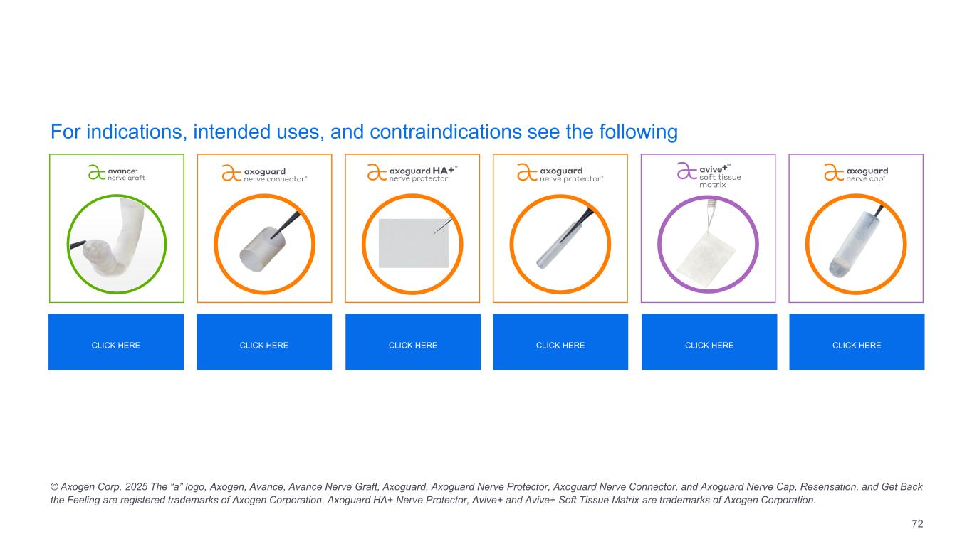 For indications, intended uses, and contraindications see the following © Axogen Corp. 2025 The “a” logo, Axogen, Avance, Avance Nerve Graft, Axoguard, Axoguard Nerve Protector, Axoguard Nerve Connector, and Axoguard Nerve Cap, Resensation, and Get Back  the Feeling are registered trademarks of Axogen Corporation. Axoguard HA+ Nerve Protector, Avive+ and Avive+ Soft Tissue Matrix are trademarks of Axogen Corporation. CLICK HERE CLICK HERE CLICK HERE CLICK HERE CLICK HERE CLICK HERE 72