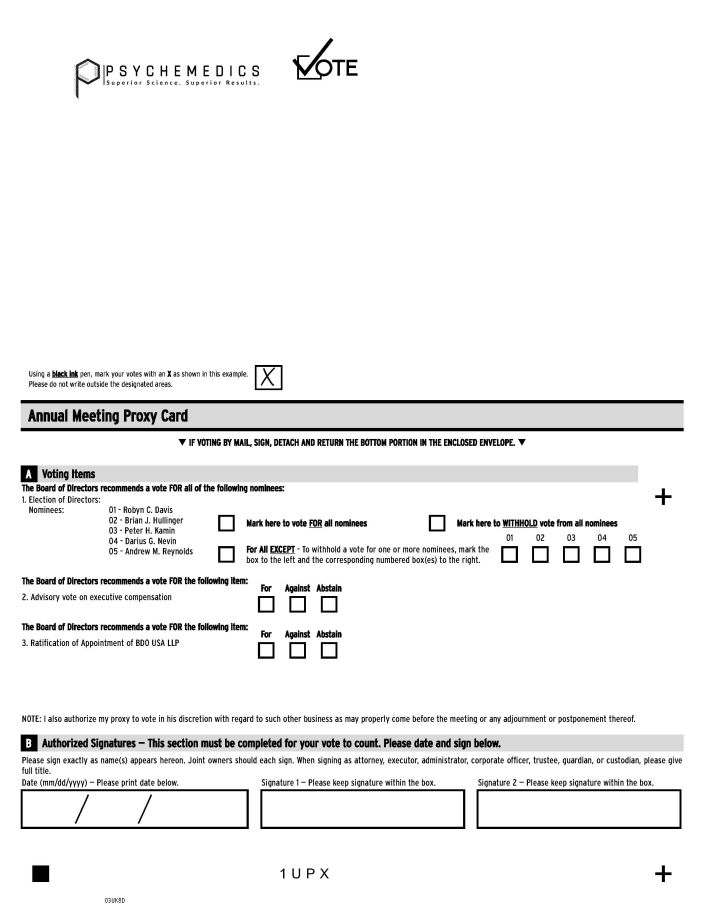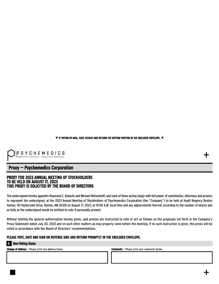 T IF VOTING BY MAIL, SIGN, DETACH AND RETURN THE BOTTOM PORTION IN THE ENCLOSED ENVELOPE. T Change of Address — Please print new address below. Comments — Please print your comments below. Non - Voting Items C + + Proxy — Psychemedics Corporation PROXY FOR 2023 ANNUAL MEETING OF STOCKHOLDERS TO BE HELD ON AUGUST 17, 2023 THIS PROXY IS SOLICITED BY THE BOARD OF DIRECTORS The undersigned hereby appoints Raymond C . Kubacki and Michael Weisenhoff, and each of them acting singly with full power of substitution, attorneys and proxies to represent the undersigned, at the 2023 Annual Meeting of Stockholders of Psychemedics Corporation (the “Company”) to be held at Hyatt Regency Boston Harbor, 101 Harborside Drive, Boston, MA 02128 on August 17 , 2023 , at 10 : 00 A . M . local time and any adjournments thereof, according to the number of shares and as fully as the undersigned would be entitled to vote if personally present . Without limiting the general authorization hereby given, said proxies are instructed to vote or act as follows on the proposals set forth in the Company’s Proxy Statement dated July 20 , 2023 and on such other matters as may properly come before the meeting . If no such instruction is given, this proxy will be voted in accordance with the Board of Directors’ recommendations . PLEASE VOTE, DATE AND SIGN ON REVERSE SIDE AND RETURN PROMPTLY IN THE ENCLOSED ENVELOPE.