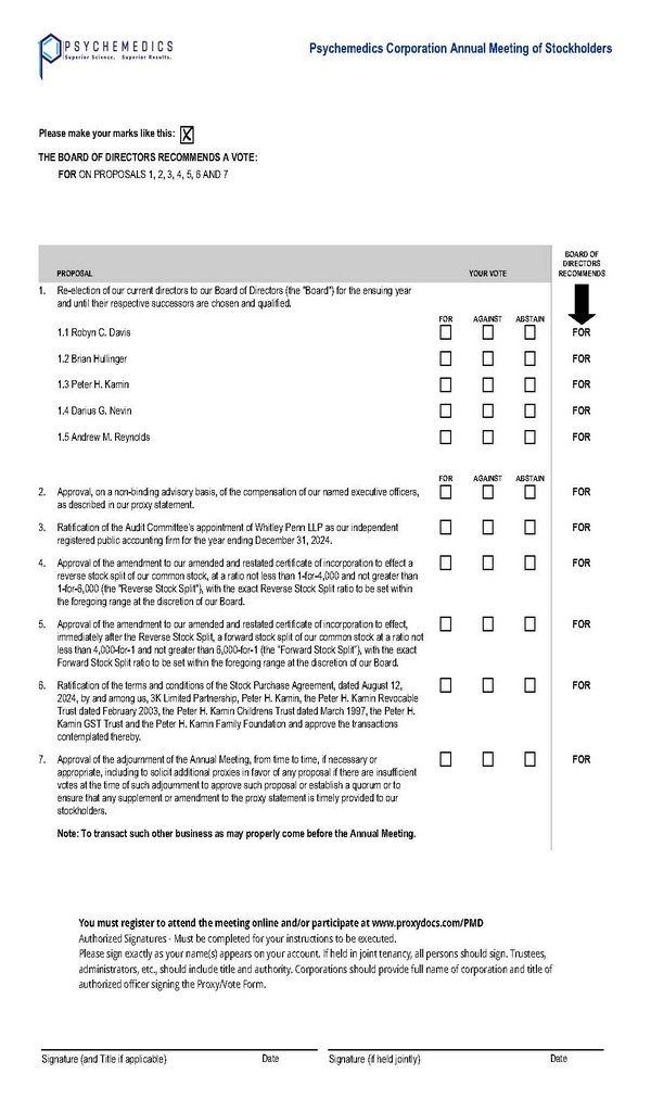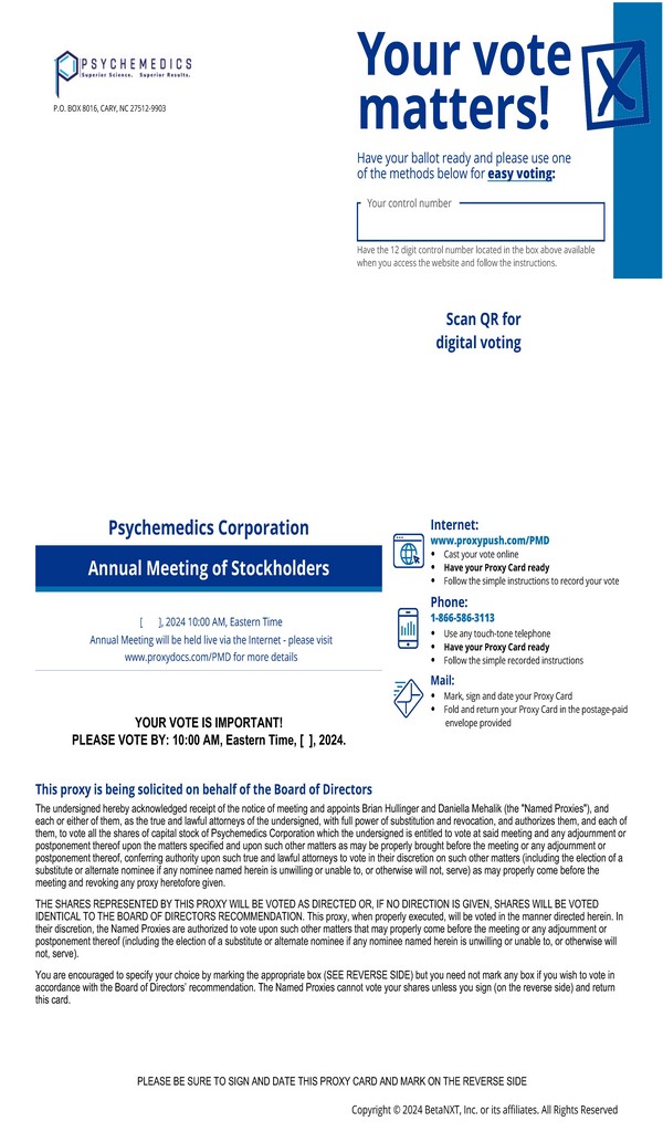The 2024 Annual Meeting of Stockholders of Psychemedics Corporation (the “Company”) will be held on [•], 2024, at 10:00 a.m. Eastern Time (the “Annual Meeting”). There will be no physical meeting location for the Annual Meeting. The Annual Meeting will be a virtual stockholder meeting, conducted via live audio webcast, through which you can submit questions and vote online. The Annual Meeting can be accessed by visiting [•] and following the instructions. The Annual Meeting will be held for the following purposes, as more fully described in the proxy statement (the “Proxy Statement”):