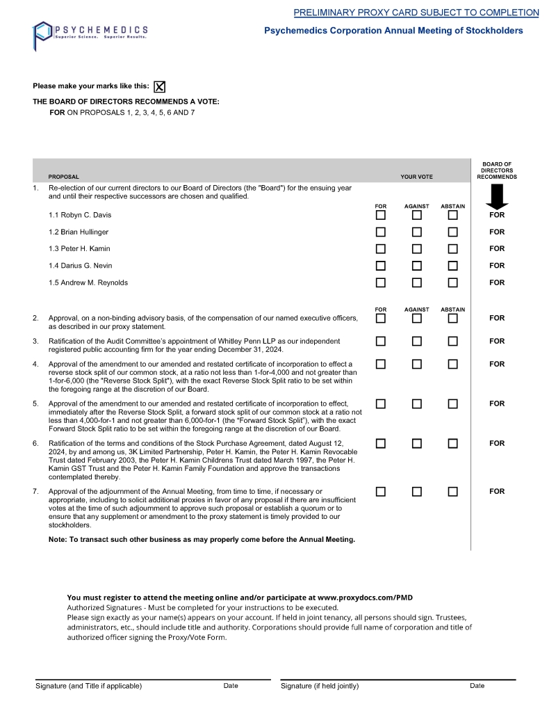The 2024 Annual Meeting of Stockholders of Psychemedics Corporation (the “Company”) will be held on [•], 2024, at 10:00 a.m. Eastern Time (the “Annual Meeting”). There will be no physical meeting location for the Annual Meeting. The Annual Meeting will be a virtual stockholder meeting, conducted via live audio webcast, through which you can submit questions and vote online. The Annual Meeting can be accessed by visiting [•] and following the instructions. The Annual Meeting will be held for the following purposes, as more fully described in the proxy statement (the “Proxy Statement”):