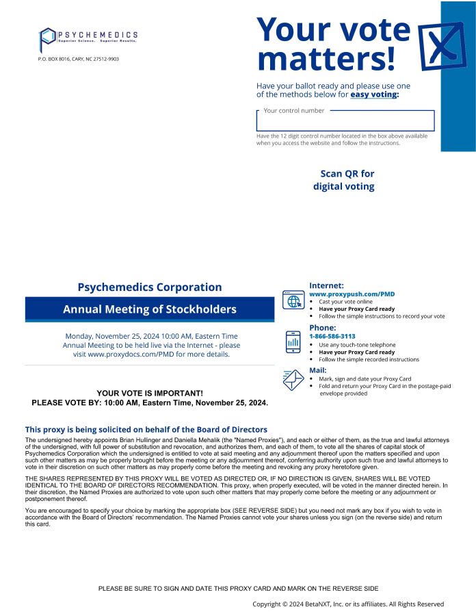 Scan QR for digital voting PLEASE BE SURE TO SIGN AND DATE THIS PROXY CARD AND MARK ON THE REVERSE SIDE Copyright © 2024 BetaNXT, Inc. or its affiliates. All Rights Reserved This proxy is being solicited on behalf of the Board of Directors The undersigned hereby appoints Brian Hullinger and Daniella Mehalik (the "Named Proxies"), and each or either of them, as the true and lawful attorneys of the undersigned, with full power of substitution and revocation, and authorizes them, and each of them, to vote all the shares of capital stock of Psychemedics Corporation which the undersigned is entitled to vote at said meeting and any adjournment thereof upon the matters specified and upon such other matters as may be properly brought before the meeting or any adjournment thereof, conferring authority upon such true and lawful attorneys to vote in their discretion on such other matters as may properly come before the meeting and revoking any proxy heretofore given. THE SHARES REPRESENTED BY THIS PROXY WILL BE VOTED AS DIRECTED OR, IF NO DIRECTION IS GIVEN, SHARES WILL BE VOTED IDENTICAL TO THE BOARD OF DIRECTORS RECOMMENDATION. This proxy, when properly executed, will be voted in the manner directed herein. In their discretion, the Named Proxies are authorized to vote upon such other matters that may properly come before the meeting or any adjournment or postponement thereof. You are encouraged to specify your choice by marking the appropriate box (SEE REVERSE SIDE) but you need not mark any box if you wish to vote in accordance with the Board of Directors’ recommendation . The Named Proxies cannot vote your shares unless you sign (on the reverse side) and return this card . Psychemedics Corporation Annual Meeting of Stockholders Monday, November 25, 2024 10:00 AM, Eastern Time Annual Meeting to be held live via the Internet - please visit www.proxydocs.com/PMD for more details. P.O. BOX 8016, CARY, NC 27512 - 9903 Internet: www.proxypush.com/PMD • Cast your vote online • Have your Proxy Card ready • Follow the simple instructions to record your vote Phone: 1 - 866 - 586 - 3113 • Use any touch - tone telephone • Have your Proxy Card ready • Follow the simple recorded instructions Mail: • Mark, sign and date your Proxy Card • Fold and return your Proxy Card in the postage - paid envelope provided YOUR VOTE IS IMPORTANT! PLEASE VOTE BY: 10:00 AM, Eastern Time, November 25, 2024. Your vote matters! Have the 12 digit control number located in the box above available when you access the website and follow the instructions. Have your ballot ready and please use one of the methods below for easy voting : Your control number