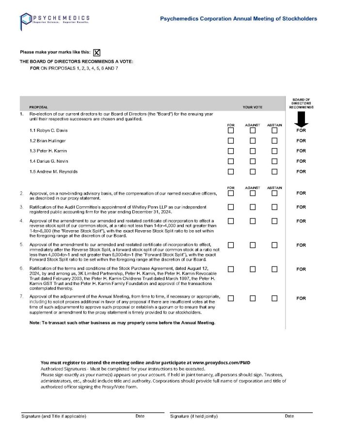 Psychemedics Corporation Annual Meeting of Stockholders Please make your marks like this: THE BOARD OF DIRECTORS RECOMMENDS A VOTE: FOR ON PROPOSALS 1, 2, 3, 4, 5, 6 AND 7 PROPOSAL YOUR VOTE BOARD OF DIRECTORS RECOMMENDS 1. Re - election of our current directors to our Board of Directors (the "Board") for the ensuing year until their respective successors are chosen and qualified. FOR AGAINST ABSTAIN 1.1 Robyn C. Davis FOR 1.2 Brian Hullinger FOR 1.3 Peter H. Kamin FOR 1.4 Darius G. Nevin FOR 1.5 Andrew M. Reynolds FOR FOR AGAINST ABSTAIN FOR FOR FOR FOR FOR FOR 2. Approval, on a non - binding advisory basis, of the compensation of our named executive officers, as described in our proxy statement. 3. Ratification of the Audit Committee’s appointment of Whitley Penn LLP as our independent registered public accounting firm for the year ending December 31, 2024. 4. Approval of the amendment to our amended and restated certificate of incorporation to effect a reverse stock split of our common stock, at a ratio not less than 1 - for - 4,000 and not greater than 1 - for - 6,000 (the "Reverse Stock Split"), with the exact Reverse Stock Split ratio to be set within the foregoing range at the discretion of our Board. 5. Approval of the amendment to our amended and restated certificate of incorporation to effect, immediately after the Reverse Stock Split, a forward stock split of our common stock at a ratio not less than 4,000 - for - 1 and not greater than 6,000 - for - 1 (the “Forward Stock Split”), with the exact Forward Stock Split ratio to be set within the foregoing range at the discretion of our Board. 6. Ratification of the terms and conditions of the Stock Purchase Agreement, dated August 12, 2024, by and among us, 3K Limited Partnership, Peter H. Kamin, the Peter H. Kamin Revocable Trust dated February 2003, the Peter H. Kamin Childrens Trust dated March 1997, the Peter H. Kamin GST Trust and the Peter H. Kamin Family Foundation and approval of the transactions contemplated thereby. 7. Approval of the adjournment of the Annual Meeting, from time to time, if necessary or appropriate, including to solicit proxies additional in favor of any proposal if there are insufficient votes at the time of such adjournment to approve such proposal or establish a quorum or to ensure that any supplement or amendment to the proxy statement is timely provided to our stockholders. Note: To transact such other business as may properly come before the Annual Meeting. You must register to attend the meeting online and/or participate at www.proxydocs.com/PMD Authorized Signatures - Must be completed for your instructions to be executed. Please sign exactly as your name(s) appears on your account. If held in joint tenancy, all persons should sign. Trustees, administrators, etc., should include title and authority. Corporations should provide full name of corporation and title of authorized officer signing the Proxy/Vote Form. Signature (and Title if applicable) Date Date Signature (if held jointly)