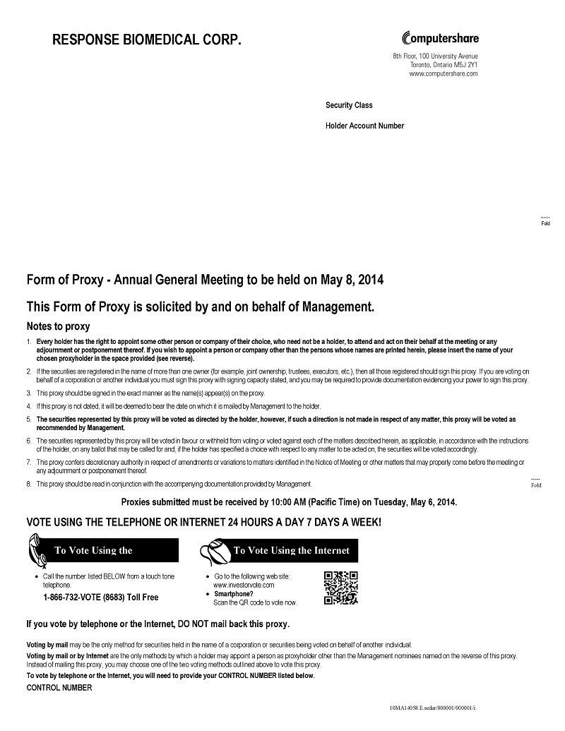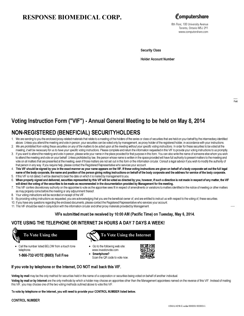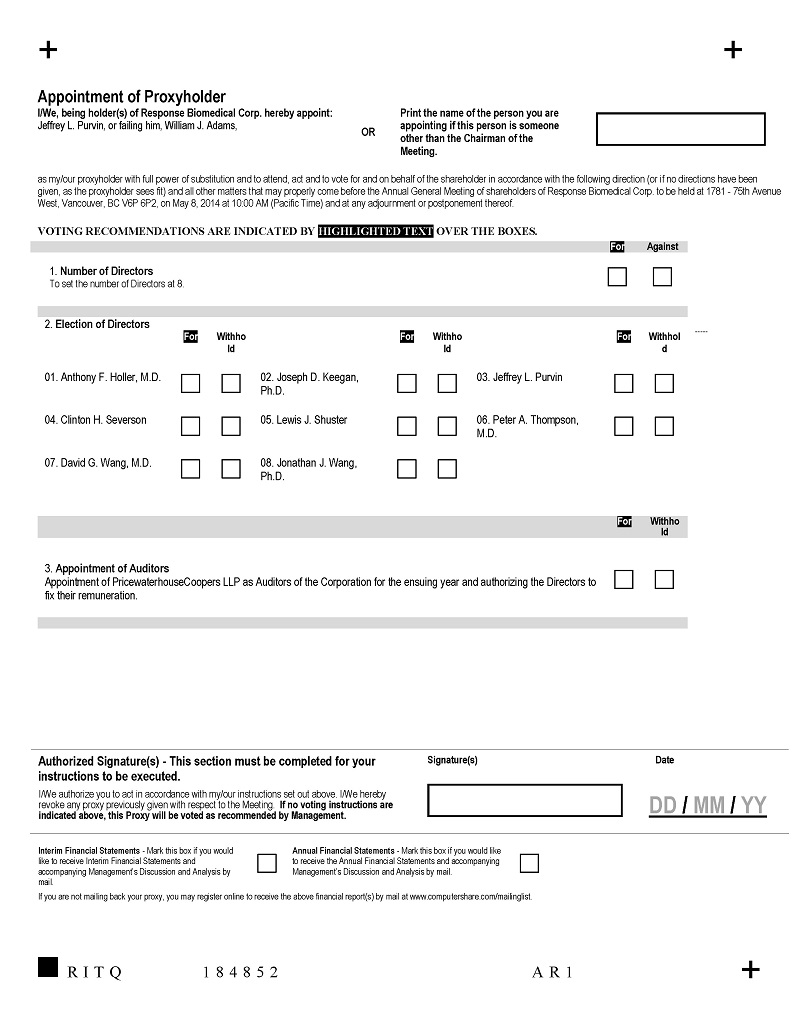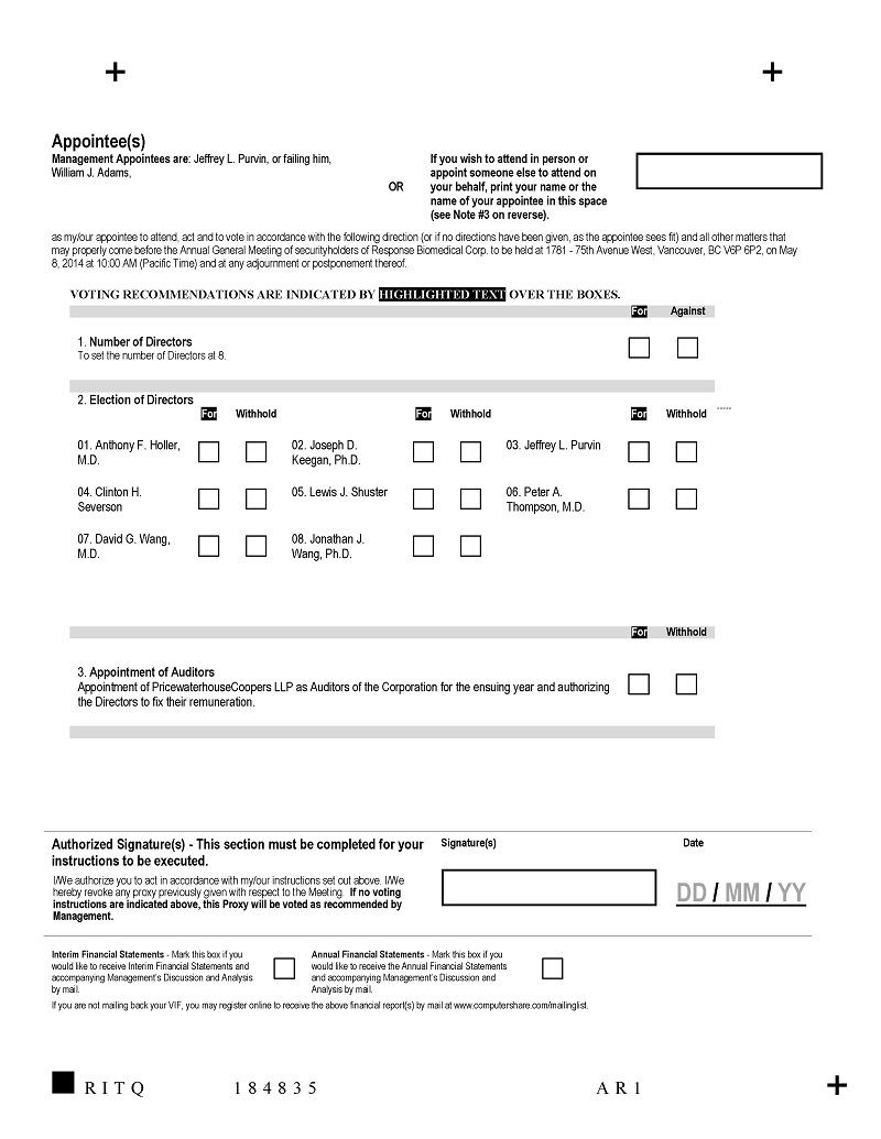 It is important that you use this opportunity to take part in the affairs of Response Biomedical Corp. (the “Company”) by voting on the business to come before the Annual Meeting. After reading the enclosed information circular, please promptly mark, sign, date and return the enclosed proxy or voting instruction form and the reply card as instructed to ensure that your shares will be represented. Regardless of the number of common shares you own, your careful consideration of, and vote on, the matters before our shareholders is important.