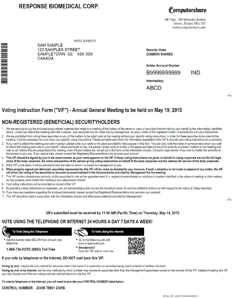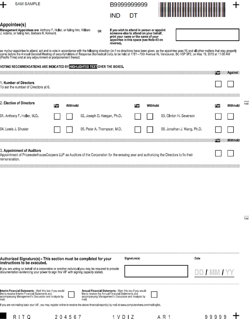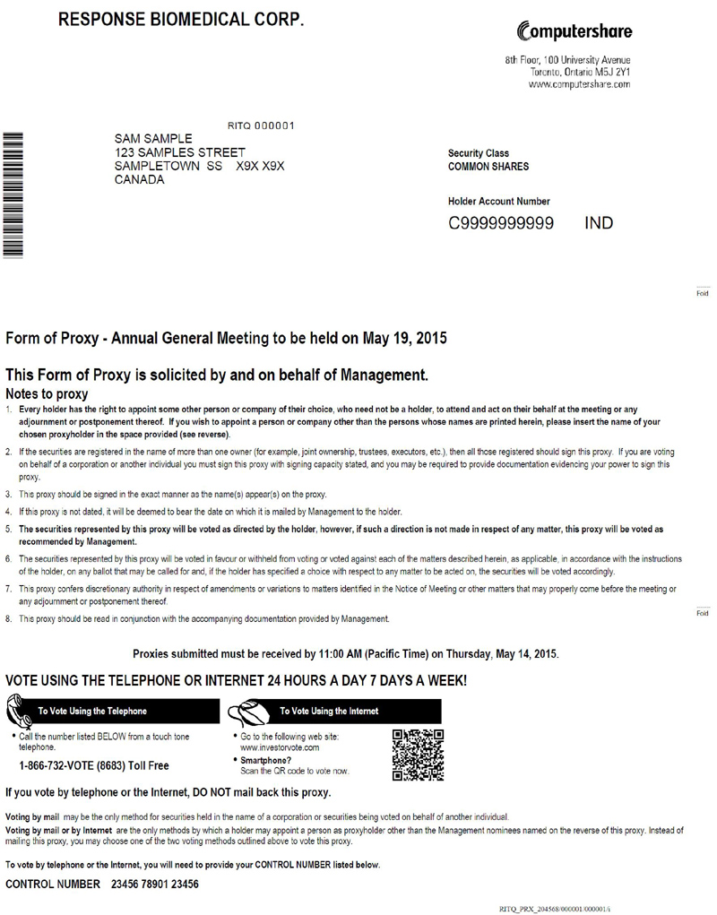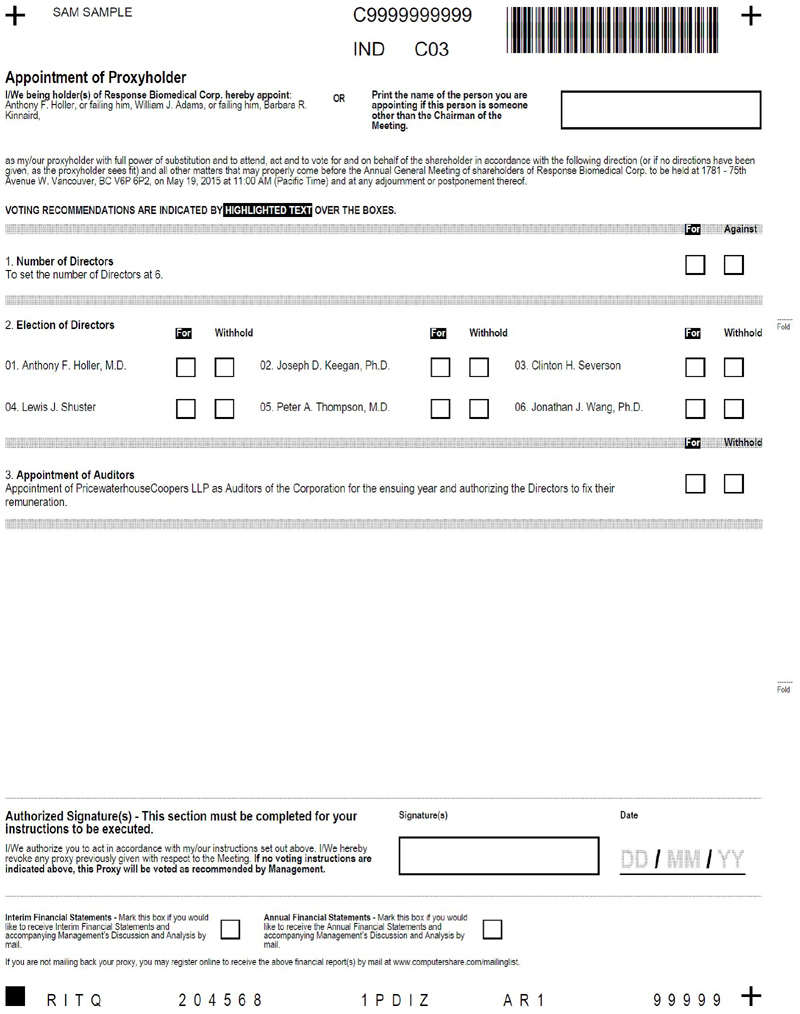 Whether or not you attend the Annual Meeting, it is important that you use this opportunity to take part in the affairs of Response Biomedical Corp. (the “Company”) by voting on the business to come before the Annual Meeting. After reading the enclosed information circular, please promptly mark, sign, date and return the enclosed proxy or voting instruction form and the reply card as instructed to ensure that your shares will be represented. Regardless of the number of common shares you own, your careful consideration of, and vote on, the matters before our shareholders is important.