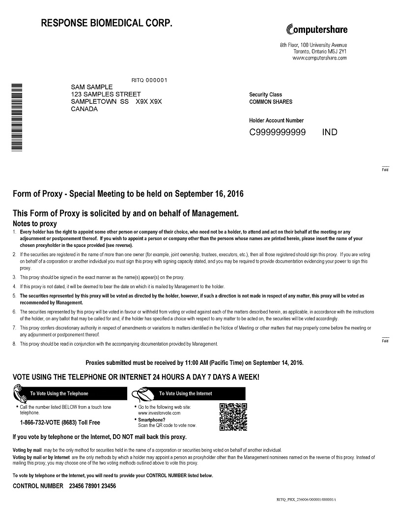 Notice is hereby given that our Special Meeting of the Shareholders of Response Biomedical Corp., will be held on Friday, September 16, 2016 at 11:00 a.m., Pacific Time at 1781 – 75th Avenue W., Vancouver, BC for the following purposes: