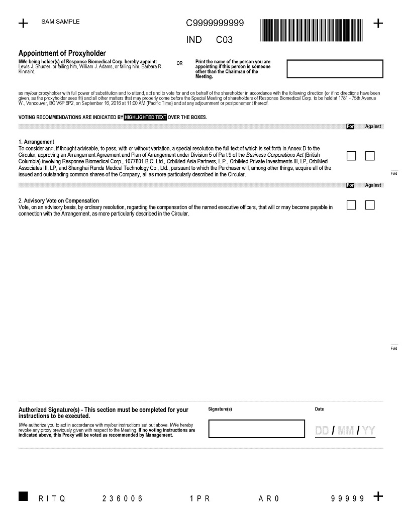 You are cordially invited to attend a special meeting of the shareholders of Response Biomedical Corp. (the “Company”), which we will hold at 11:00 a.m., Pacific Time, on Friday, September 16, 2016, at our corporate office located at 1781 - 75th Avenue W., Vancouver, BC (the “Special Meeting”). Formal notice of the Special Meeting, a proxy statement, and a proxy card accompany this letter.