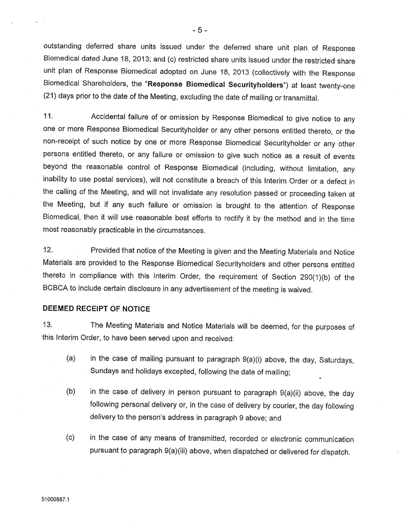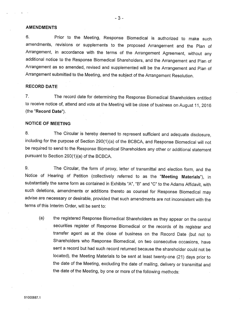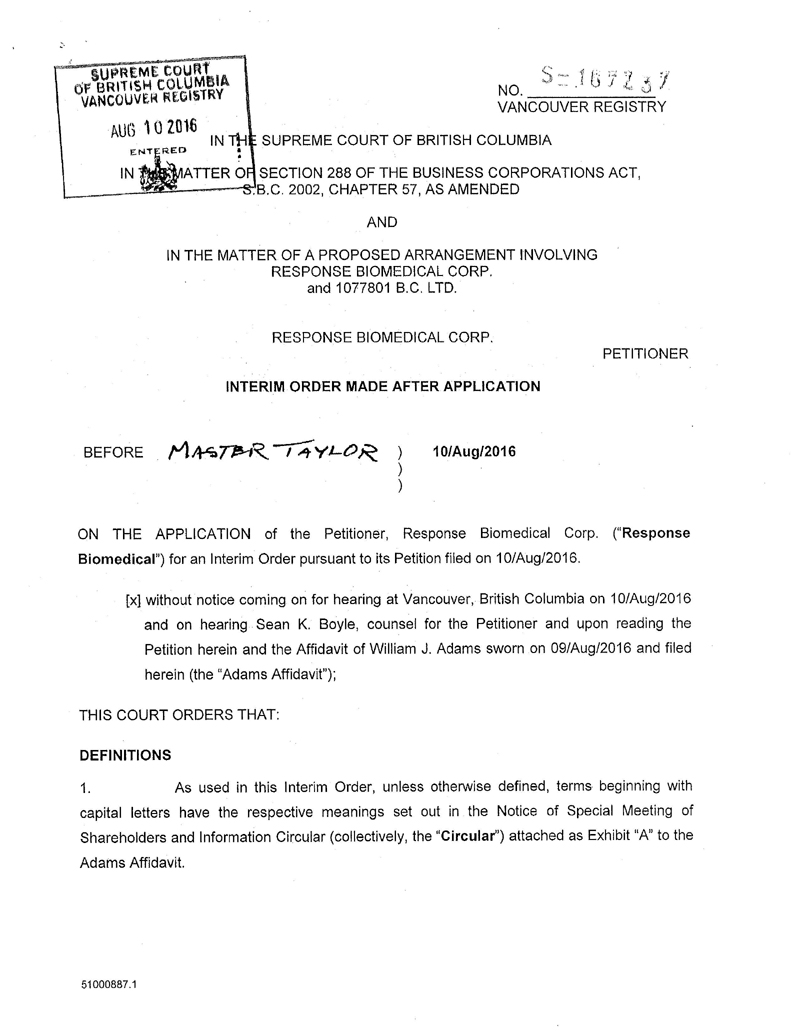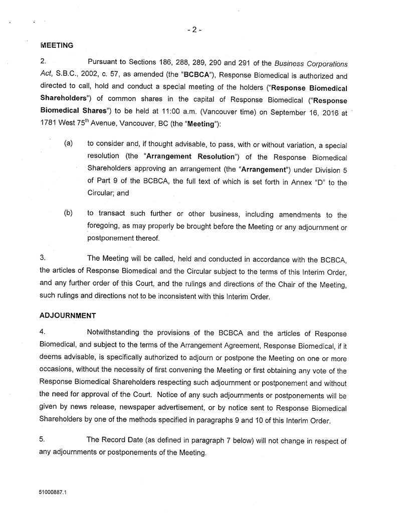 AND NOTICE IS FURTHER GIVEN that by an Interim Order Made After Application, pronounced by the Court on 10/Aug/2016, the Court has given directions as to the calling of a special meeting of the Response Biomedical Shareholders for the purpose of, among other things, considering, and voting upon the special resolution to approve the Arrangement;