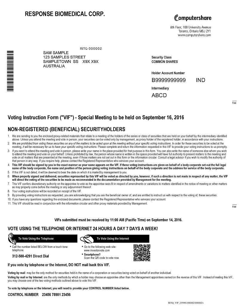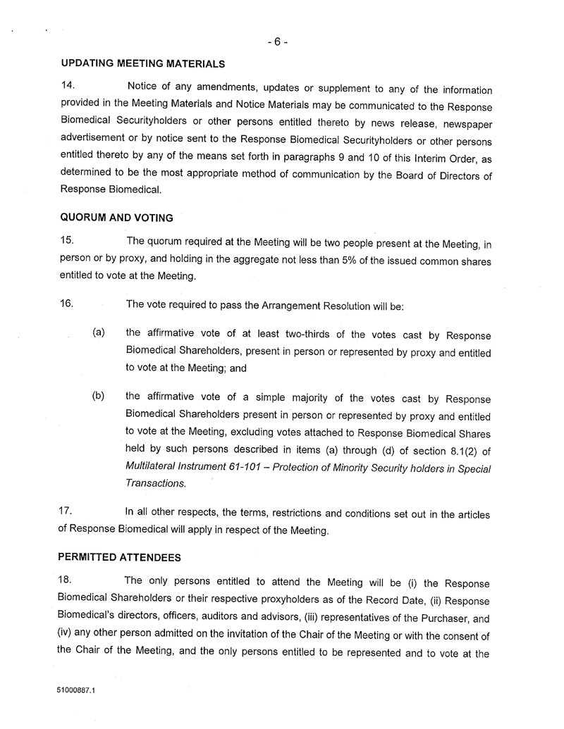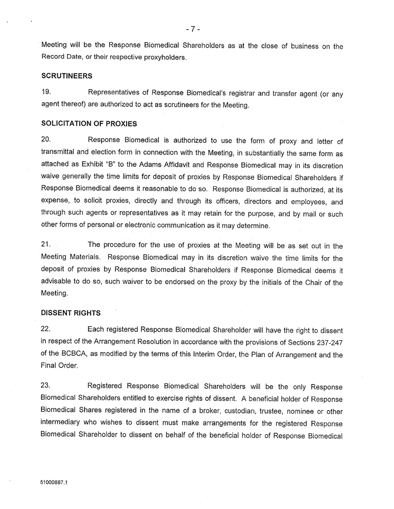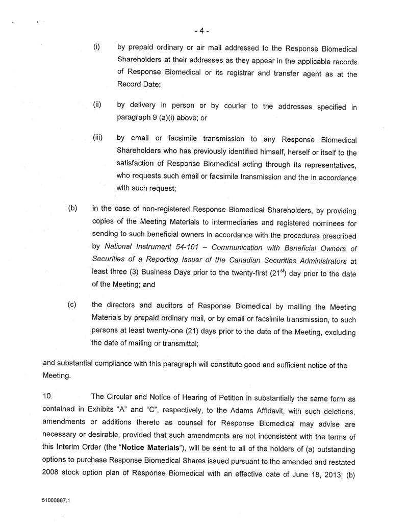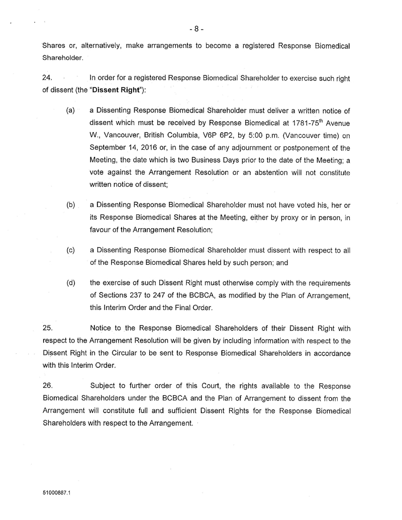 AND NOTICE IS FURTHER GIVEN that by an Interim Order Made After Application, pronounced by the Court on 10/Aug/2016, the Court has given directions as to the calling of a special meeting of the Response Biomedical Shareholders for the purpose of, among other things, considering, and voting upon the special resolution to approve the Arrangement;