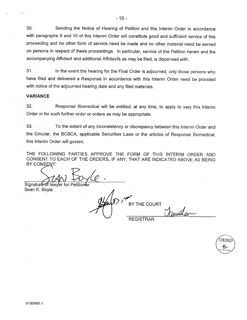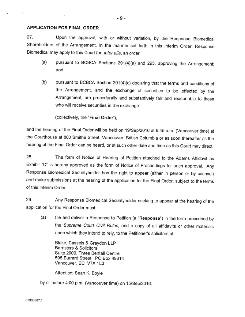 AND NOTICE IS FURTHER GIVEN that an application for a Final Order approving the Arrangement and for a determination that the terms and conditions of the Arrangement are procedurally and substantively fair and reasonable to the Response Biomedical Shareholders, and shall be made before the presiding Judge in Chambers at the Courthouse, 800 Smithe Street, Vancouver, British Columbia on 19/Sep/2016 at 9:45 am (Vancouver time), or as soon thereafter as counsel may be heard (the “Final Application”).