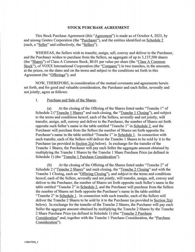 t < t STOCK PURCHASE AGREEMENT This Stock Purchase Agreement (this “Agreement”) is made as of October 4, 2023, by and among Gentex Corporation (the “Purchaser”), and the entities identified on Schedule 2 (each, a “Sill:er” and collectively, the “ik:rs”). WHEREAS, the Sellers wish to transfer, assign, sell, convey and deliver to the Purchaser, and the Purchaser wishes to purchase from the Sellers, an aggregate of up to 3,137,500 shares (the “Shares”) of Class A Common Stock, $0.01 par value per share (the “Class A Common Stock”), of VOXX International Corporation (the “Company”) in two tranches, in the amounts, at the prices, on the dates and on the terms and subject to the conditions set forth in this Agreement (the “Offerings”); and NOW, THEREFORE, in consideration of the mutual covenants and agreements herein set forth, and for good and valuable consideration, the Purchaser and each Seller, severally and not jointly, agree as follows: 1. Purchase and Sale of the Shares. (a) At the closing of the Offering of the Shares listed under “Tranche 1” of Schedule 2 (“Tranche l Shares” and such closing, the “Tranche 1 Closing”), and subject to the terms and conditions hereof, each of the Sellers, severally and not jointly, will transfer, assign, sell, convey and deliver to the Purchaser, the number of Shares set forth opposite such Seller’s name in the table entitled “Tranche 1” in Schedule 2, and the Purchaser will purchase from the Sellers the number of Shares set forth opposite the Purchaser’s name in the table entitled “Tranche 1” in Schedule 1. In connection with such transfer", each of the Sellers will deliver the Tranche 1 Shares to be sold by it to the Purchaser (as provided in Section 21 at below). In exchange for the transfer of the Tranche l Shares, the Purchaser will pay each Seller the aggregate amount obtained by multiplying the Tranche 1 Shares by the Tranche l Share Purchase Price (as defined in Schedule 1) (the “Tranche 1 Purchase Consideration”). (b) At the closing of the Offering of the Shares listed under “Tranche 2” of Schedule 2 (“Tranche 2 Shares” and such closing, the “Tranche 2 Closing” and with the Tranche l Closing, each an “Offering Closing”), and subject to the terms and conditions hereof, each of the Sellers, severally and not jointly, will transfer, assign, sell, convey and deliver to the Purchaser, the number of Shares set folth opposite such Seller’s name in the table entitled “Tranche 2” in Schedule 2, and the Purchaser will purchase from the Sellers the number of Shares set forth opposite the Purchaser’s name in the table entitled “Tranche 2” in Schedule 1. In connection with such transfer, each of the Sellers will deliver the Tranche 2 Shares to be sold by it to the Purchaser (as provided in Section 2(a) below). In exchange for the transfer of the Tranche 2 Shares, the Purchaser will pay each Seller the aggregate amount obtained by multiplying the Tranche 2 Shares by the Tranche 2 Share Purchase Price (as defined in Schedule 1) (the “Tranche 2 Purchase Consideration” and, together with the Tranche l Purchase Consideration, the “Purchase ”)- l38827006_3 5 1 3 l s t 1 1 (c) Subject to the satisfaction or waiver of the conditions set forth in Section 5 below (other than conditions that by their nature are to be satisfied at the applicable Offering Closing, but subject to the satisfaction or waiver of those conditions at such time), (i) the Tranche 1 Closing shall occur on October 6, 2023 (the “Tranche 1 Settlement Date”) and (ii) the Tranche 2 Closing shall occur on or about