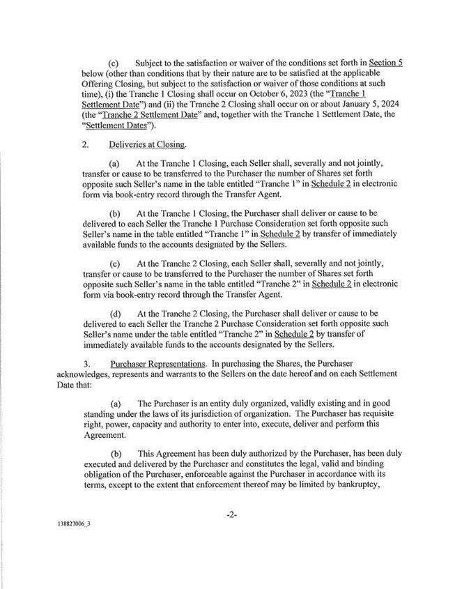 January 5, 2024 (the “Tranche 2 Settlement Date” and, together witl1 the Tranche 1 Settlement Date, the “Settlement Dates”). 2. Deliveries at Closing. (a) At the Tranche 1 Closing, each Seller shall, severally and not jointly, transfer or cause to be transferred to the Purchaser the number of Shares set forth opposite such Seller’s name in the table entitled “Tranche 1” in Schedule 2 in electronic form via book-entry record through the Transfer Agent. (b) At the Tranche 1 Closing, the Purchaser shall deliver or cause to be delivered to each Seller the Tranche 1 Purchase Consideration set forth opposite such Seller’s name in the table entitled “Tranche 1” in Schedule 2 by transfer of immediately available funds to the accounts designated by the Sellers. (c) At the Tranche 2 Closing, each Seller shall, severally and not jointly, transfer or cause to be transferred to the Purchaser the number of Shares set forth opposite such Seller’s name in the table entitled “Tranche 2” in Schedule 2 in electronic form via book-entry record through the Transfer Agent. (d) At the Tranche 2 Closing, the Purchaser shall deliver or cause to be delivered to each Seller the Tranche 2 Purchase Consideration set forth opposite such Seller’s name under the table entitled “Tranche 2” in Schedule 2 by transfer of immediately available funds to the accounts designated by the Sellers. 3. Purchaser Representations. In purchasing the Shares, the Purchaser acknowledges, represents and warrants to the Sellers on the date hereof and on each Settlement Date that: (a) The Purchaser is an entity duly organized, validly existing and in good standing under the laws of its jurisdiction of organization. The Purchaser has requisite right, power, capacity and authority to enter into, execute, deliver and perform this Agreement. (b) This Agreement has been duly authorized by the Purchaser, has been duly executed and delivered by the Purchaser and constitutes the legal, valid and binding obligation of the Purchaser, enforceable against the Purchaser in accordance with its terms, except to the extent that enforcement thereof may be limited by bankruptcy, -2- 138827006_3 » E z E 2 insolvency, reorganization or other laws affecting enforcement of creditors’ rights or by general equitable principles. (c) The purchase of the Shares by the Purchaser hereunder will not conflict with, result in a breach or violation of, or constitute a default under, (i) any law applicable to the Purchaser, (ii) the charter documents of the Purchaser or (m) the terms of any indenture or other agreement or instrument to which the Purchaser is a party or bound, or any judgment, order or decree applicable to the Purchaser of any court, regulatory body, administrative agency, governmental body or arbitrator having jurisdiction over the Purchaser, except in the cases of (i) and (m), for any such conflict, breach, violation or default that would not materially and adversely affect the purchase of the Shares and the consummation of the transactions contemplated herein. (d) No consent, approval, authorization or order of, or filing by the Purchaser with, any court, governmental agency