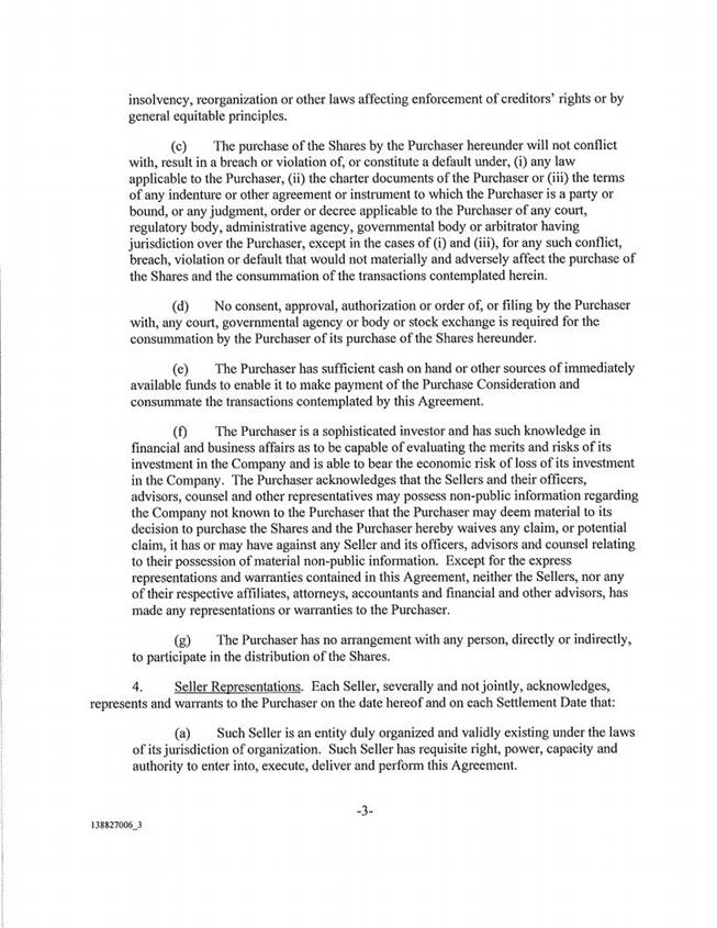 or body or stock exchange is required for the consummation by the Purchaser of its purchase of the Shares hereunder. (e) The Purchaser has sufficient cash on hand or other sources of immediately available funds to enable it to make payment of the Purchase Consideration and consummate the transactions contemplated by this Agreement. (f) The Purchaser is a sophisticated investor and has such knowledge in financial and business affairs as to be capable of evaluating the merits and risks of its investment in the Company and is able to bear the economic risk of loss of its investment in the Company. The Purchaser acknowledges that the Sellers and their officers, advisors, counsel and other representatives may possess non-public information regarding the Company not known to the Purchaser that the Purchaser may deem material to its decision to purchase the Shares and the Purchaser hereby waives any claim, or potential claim, it has or may have against any Seller and its officers, advisors and counsel relating to their possession of material non-public information. Except for the express representations and warranties contained in this Agreement, neither the Sellers, nor any of their respective affiliates, attorneys, accountants and financial and other advisors, has made any representations or warranties to the Purchaser. (g) The Purchaser has no arrangement with any person, directly or indirectly, to participate in the distribution of the Shares. 4. Seller Representations. Each Seller, severally and not jointly, acknowledges, represents and warrants to the Purchaser on the date hereof and on each Settlement Date that: (a) Such Seller is an entity duly organized and validly existing under the laws of its jurisdiction of organization. Such Seller has requisite right, power, capacity and authority to enter into, execute, deliver and perform this Agreement. -3- l38827006_3 (b) This Agreement has been duly authorized, executed and delivered by such Seller and constitutes the legal, valid and binding obligation of such Seller, enforceable against such Seller in accordance with their terms, except to the extent that enforcement thereof may be limited by bankruptcy, insolvency, reorganization or other laws affecting enforcement of creditors’ rights or by general equitable principles. (c) Such Seller is the record and beneficial owner of the Shares to be sold by it in the Offering, and upon the applicable Offering Closing will transfer to the Purchaser good and marketable title to, or a valid “security entitlement” within the meaning of Section 8~50l of the New York Uniform Commercial Code in respect of, all such Shares, free and clear of any liens, claims, security interests, restrictions, options or other encumbrances of any kind, other than transfer restrictions under federal and state securities laws. Such Seller has not granted any option of any sort with respect to such Shares or any right to acquire such Shares or any interest therein other than to the Purchaser under this Agreement. (d) The transfer of the Shares to be sold by such Seller in the Offering will not conflict with, result in a breach or violation of, or constitute a default under, (i) any law applicable to such Seller or, (ii) the limited partnership agreement, general partnership agreement or other organizational document, as applicable, of such Seller or (m) the terms of any indenture or other agreement or instrument to which such Seller is a patty or bound, or any judgment, order or decree applicable to such Seller of any court, regulatory body, administrative agency, governmental body or