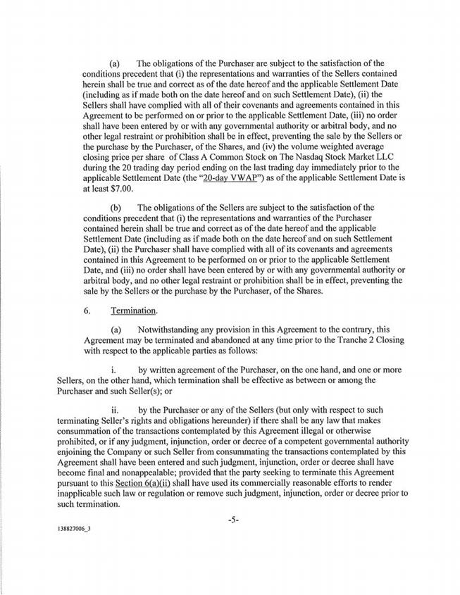 arbitrator having jurisdiction over such Seller, except in the cases of (i) and (m), for any such conflict, breach, violation or default that would not materially and adversely affect the sale of the Shares and the consummation of the transactions contemplated herein. (e) No consent, approval, authorization or order of, or filing by such Seller with, any court, governmental agency or body or stock exchange is required for the consummation by such Seller of the sale of the Shares to be sold by such Seller in the Offering, except as may be required by applicable securities laws in connection with the offer and sale of the Shares. (f) Such Seller has not engaged any investment banker, broker, or finder in connection with the Offering, and no broker’s or similar fee is payable by such Seller or any of its affiliates in connection with the transfer of the Shares owned by such Seller hereunder. " (g) Except for the express representations and warranties contained in this Agreement, neither the Purchaser, nor any of its affiliates, attorneys, accountants and financial and other advisors, has made any representations or warranties to such Seller. 5. Conditions Precedent to Obligations of the Sellers and Purchaser. -4- 138827006 3 K i 1 (a) The obligations of the Purchaser are subject to the satisfaction of the conditions precedent that (i) the representations and warranties of the Sellers contained herein shall be true and correct as of the date hereof and the applicable Settlement Date (including as if made both on the date hereof and on such Settlement Date), (ii) the Sellers shall have complied with all of their covenants and agreements contained in this Agreement to be performed on or prior to the applicable Settlement Date, (m) no order shall have been entered by or with any governmental authority or arbitral body, and no other legal restraint or prohibition shall be in effect, preventing the sale by the Sellers or the purchase by the Purchaser, of the Shares, and (iv) the volume weighted average closing price per share of Class A Common Stock on The Nasdaq Stock Market LLC during the 20 trading day period ending on the last trading day immediately prior to the applicable Settlement Date (the “Z0-day VWAP”) as of the applicable Settlement Date is at least $7.00. (b) The obligations of the Sellers are subject to the satisfaction of the conditions precedent that (i) the representations and warranties of the Purchaser contained herein shall be true and correct as of the date hereof and the applicable Settlement Date (including as if made both on the date hereof and on such Settlement Date), (ii) the Purchaser shall have complied with all of its covenants and agreements contained in this Agreement to be performed on or prior to the applicable Settlement Date, and (m) no order shall have been entered by or with any governmental authority or arbitral body, and no other legal restraint or prohibition shall be in effect, preventing the sale by the Sellers or the purchase by the Purchaser, of the Shares. 6. Termination. (a) Notwithstanding any provision in this Agreement to the contrary, this Agreement may be terminated and abandoned at any time prior to the Tranche 2 Closing with respect to the applicable parties as follows: i. by written agreement of the Purchaser, on the one hand, and one or more Sellers, on the other hand, which termination shall be effective as between or among the Purchaser and such Seller(s); or ii. by the Purchaser or any of the Sellers (but only with respect to such terminating Seller’s rights and obligations hereunder) if there