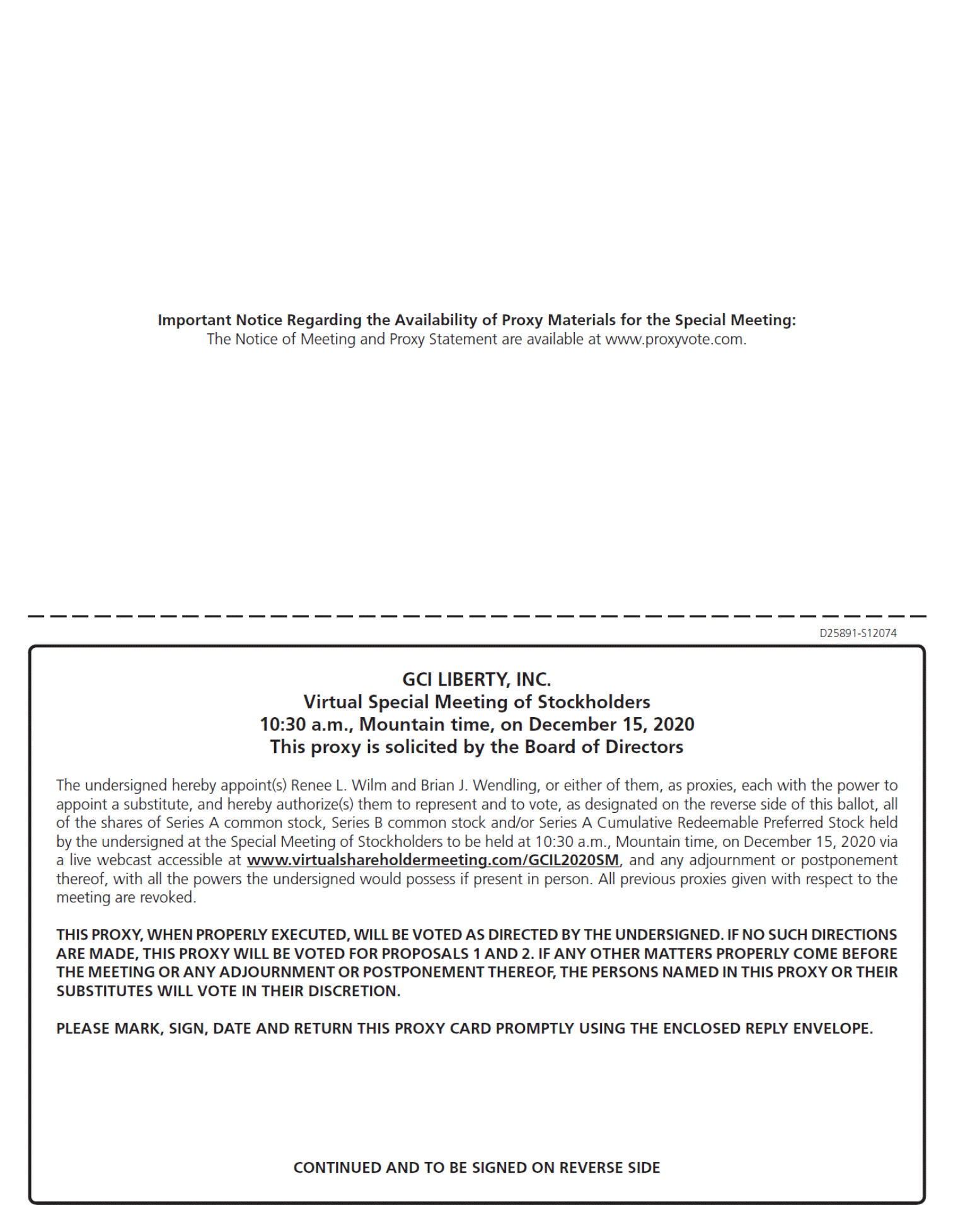 Important Notice Regarding the Availability of Proxy Materials for the Special Meeting: The Notice of Meeting and Proxy Statement are available at www.proxyvote.com. D25891-S12074 GCI LIBERTY, INC. Virtual Special Meeting of Stockholders 10:30 a.m., Mountain time, on December 15, 2020 This proxy is solicited by the Board of Directors The undersigned hereby appoint(s) Renee L. Wilm and Brian J. Wendling, or either of them, as proxies, each with the power to appoint a substitute, and hereby authorize(s) them to represent and to vote, as designated on the reverse side of this ballot, all of the shares of Series A common stock, Series B common stock and/or Series A Cumulative Redeemable Preferred Stock held by the undersigned at the Special Meeting of Stockholders to be held at 10:30 a.m., Mountain time, on December 15, 2020 via a live webcast accessible at www.virtualshareholdermeeting.com/GCIL2020SM, and any adjournment or postponement thereof, with all the powers the undersigned would possess if present in person. All previous proxies given with respect to the meeting are revoked. THIS PROXY, WHEN PROPERLY EXECUTED, WILL BE VOTED AS DIRECTED BY THE UNDERSIGNED. IF NO SUCH DIRECTIONS ARE MADE, THIS PROXY WILL BE VOTED FOR PROPOSALS 1 AND 2. IF ANY OTHER MATTERS PROPERLY COME BEFORE THE MEETING OR ANY ADJOURNMENT OR POSTPONEMENT THEREOF, THE PERSONS NAMED IN THIS PROXY OR THEIR SUBSTITUTES WILL VOTE IN THEIR DISCRETION. PLEASE MARK, SIGN, DATE AND RETURN THIS PROXY CARD PROMPTLY USING THE ENCLOSED REPLY ENVELOPE. CONTINUED AND TO BE SIGNED ON REVERSE SIDE