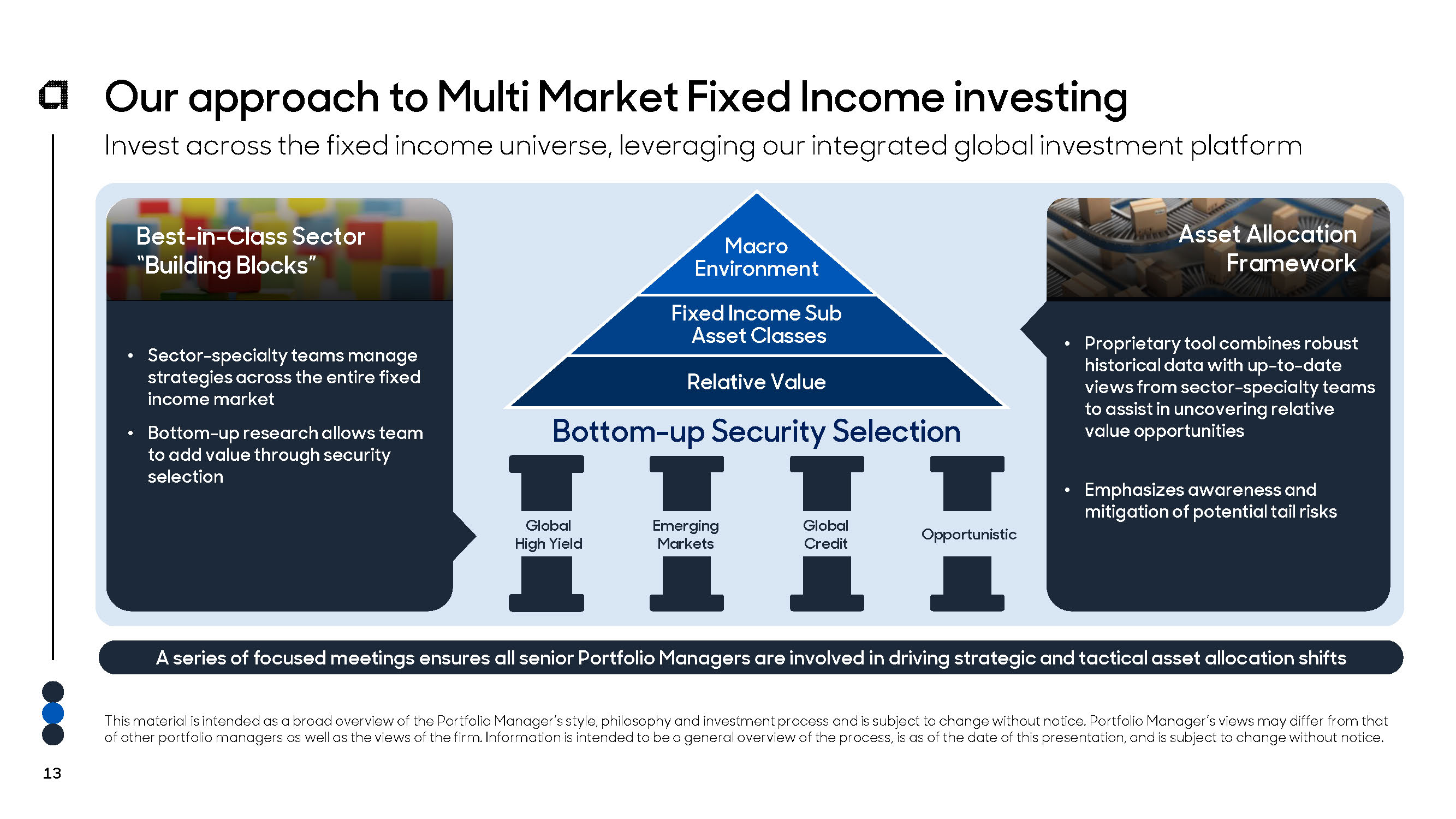 Our approach to Multi Market Fixed Income investing Invest across the fixed income universe, leveraging our integrated global investment platform Best-in-Class Sector “Building Blocks” • Sector-specialty teams manage strategies across the entire fixed income market • Bottom-up research allows team to add value through security selection • • Macro • Environment • • Fixed Income Sub Asset Classes • • Relative Value • Bottom-up Security Selection • Global • High Yield • Emerging • Markets • Global • Credit • Opportunistic • Asset Allocation • Framework • Proprietary tool combines robust • historical data with up-to-date views from sector-specialty teams to assist in uncovering relative value opportunities • Emphasizes awareness and • mitigation of potential tail risks A series of focused meetings ensures all senior Portfolio Managers are involved in driving strategic and tactical asset allocation shifts This material is intended as a broad overview of the Portfolio Manager’s style, philosophy and investment process and is subject to change without notice. Portfolio Manager’s views may differ from that of other portfolio managers as well as the views of the firm. Information is intended to be a general overview of the process, is as of the date of this presentation, and is subject to change without notice. 13