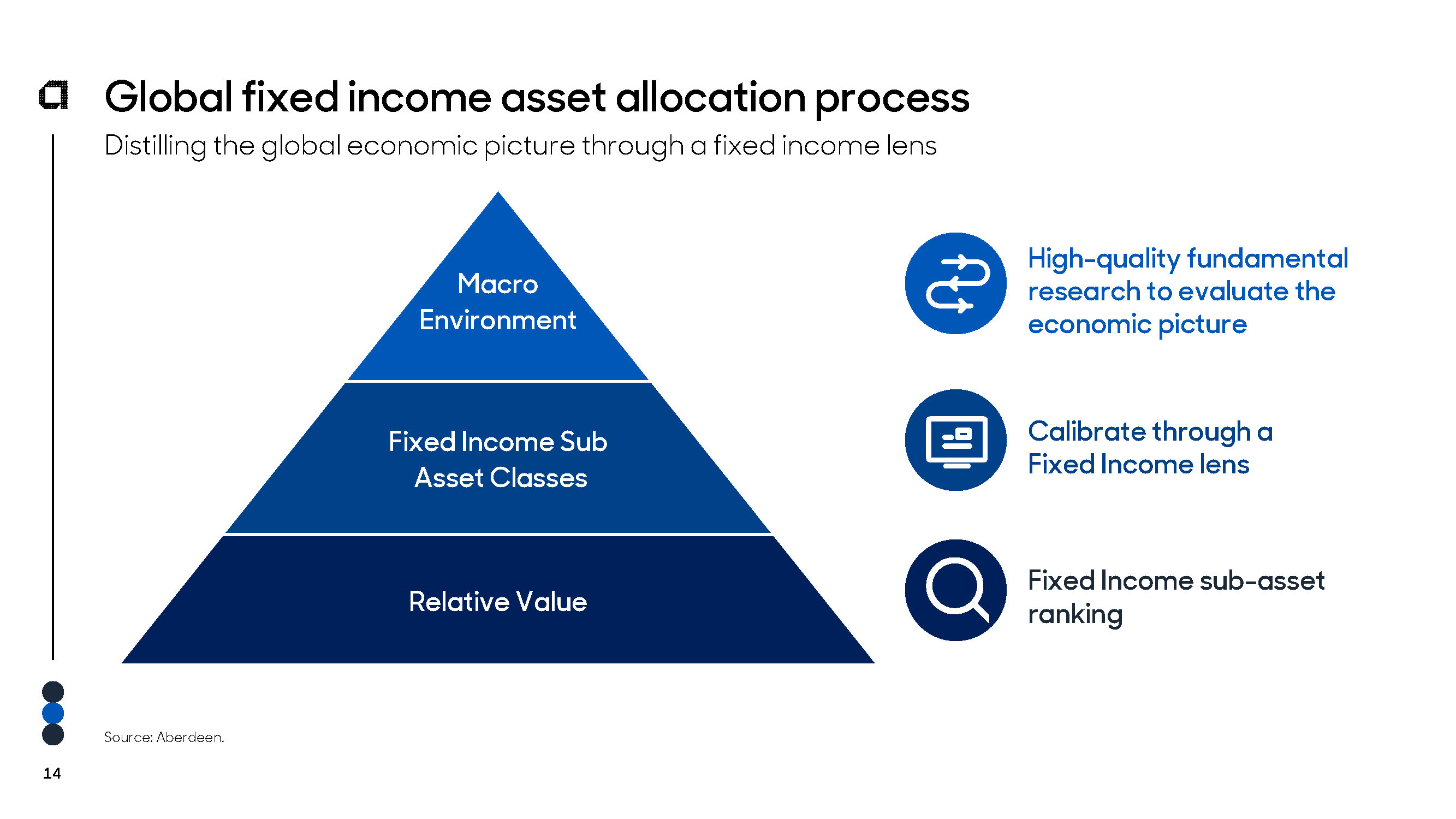 Global fixed income asset allocation process Distilling the global economic picture through a fixed income lens Macro Environment Fixed Income Sub Asset Classes Relative Value High-quality fundamental research to evaluate the economic picture Calibrate through a Fixed Income lens Fixed Income sub-asset ranking Source: Aberdeen. 14