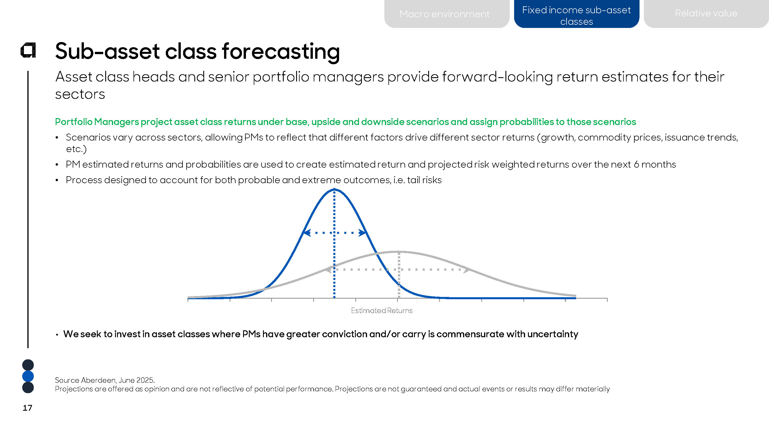 Macro environment Fixed income sub-asset classes Relative value Sub-asset class forecasting Macro environment Fixed income sub-asset classes Relative value Asset class heads and senior portfolio managers provide forward-looking return estimates for their sectors Portfolio Managers project asset class returns under base, upside and downside scenarios and assign probabilities to those scenarios • Scenarios vary across sectors, allowing PMs to reflect that different factors drive different sector returns (growth, commodity prices, issuance trends, etc.) • PM estimated returns and probabilities are used to create estimated return and projected risk weighted returns over the next 6 months • Process designed to account for both probable and extreme outcomes, i.e. tail risks Estimated Returns • We seek to invest in asset classes where PMs have greater conviction and/or carry is commensurate with uncertainty Source Aberdeen, June 2025. Projections are offered as opinion and are not reflective of potential performance. Projections are not guaranteed and actual events or results may differ materially 17