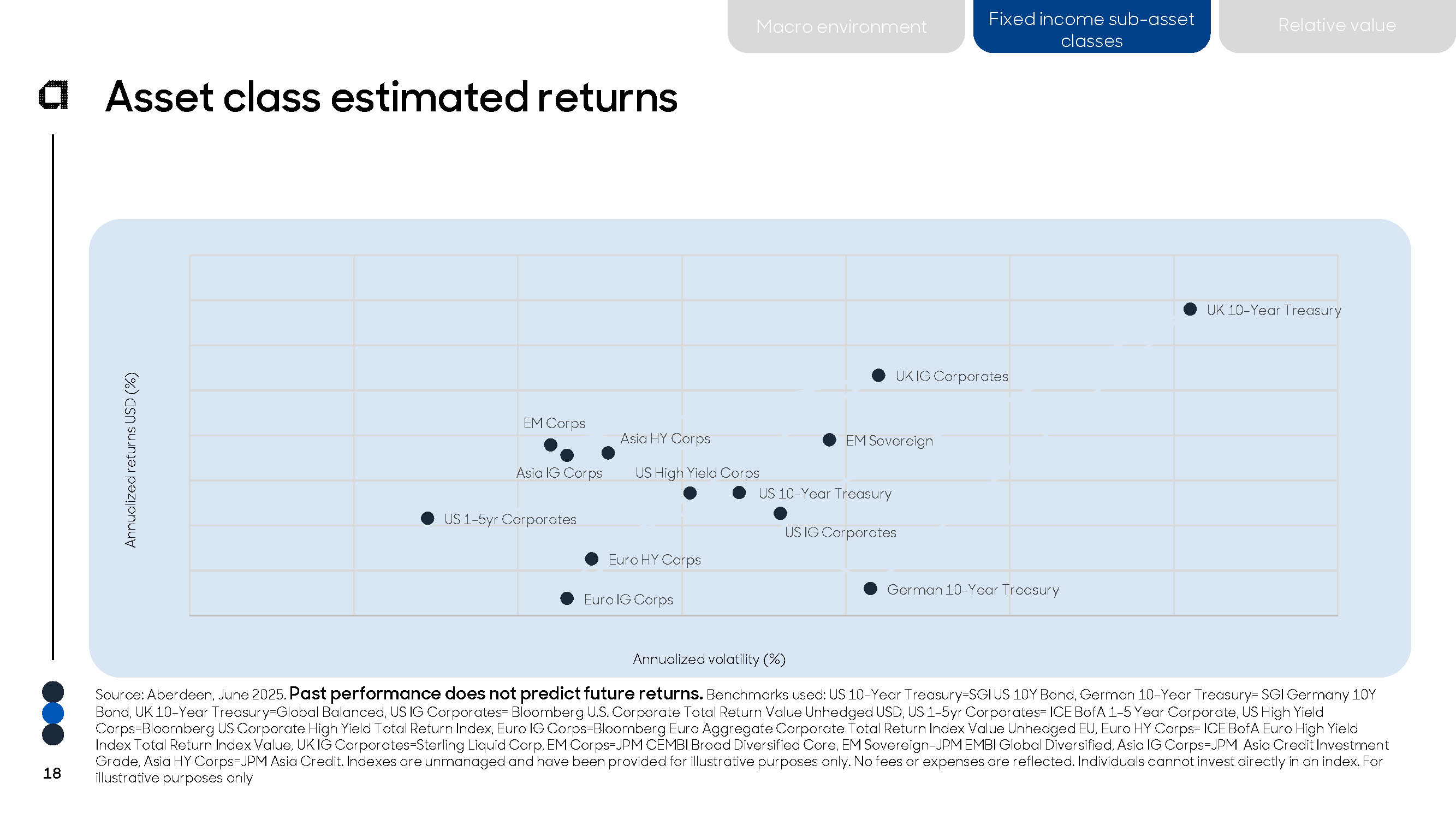 Macro environment Fixed income sub-asset classes Relative value Asset class estimated returns Macro environment Fixed income sub-asset classes Relative value Source: Aberdeen, June 2025. Past performance does not predict future returns. Benchmarks used: US 10-Year Treasury=SGI US 10Y Bond, German 10-Year Treasury= SGI Germany 10Y Bond, UK 10-Year Treasury=Global Balanced, US IG Corporates= Bloomberg U.S. Corporate Total Return Value Unhedged USD, US 1-5yr Corporates= ICE BofA 1-5 Year Corporate, US High Yield Corps=Bloomberg US Corporate High Yield Total Return Index, Euro IG Corps=Bloomberg Euro Aggregate Corporate Total Return Index Value Unhedged EU, Euro HY Corps= ICE BofA Euro High Yield Index Total Return Index Value, UK IG Corporates=Sterling Liquid Corp, EM Corps=JPM CEMBI Broad Diversified Core, EM Sovereign-JPM EMBI Global Diversified, Asia IG Corps=JPM Asia Credit Investment Grade, Asia HY Corps=JPM Asia Credit. Indexes are unmanaged and have been provided for illustrative purposes only. No fees or expenses are reflected. Individuals cannot invest directly in an index. For 18 illustrative purposes only
