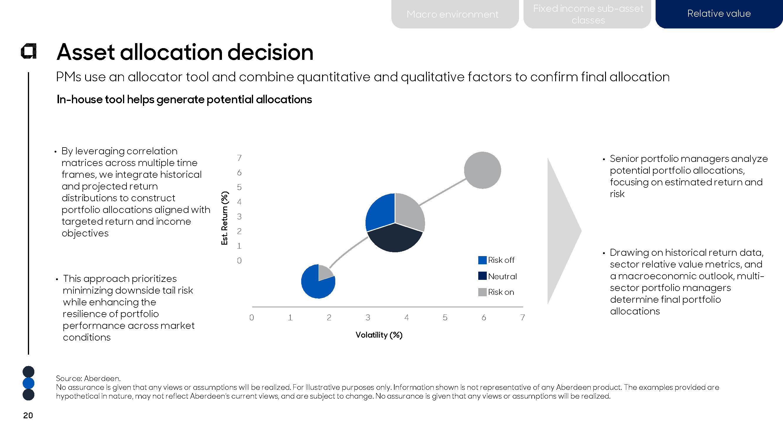 Macro environment Fixed income sub-asset classes Relative value Asset allocation decision PMs use an allocator tool and combine quantitative and qualitative factors to confirm final allocation In-house tool helps generate potential allocations • By leveraging correlation matrices across multiple time frames, we integrate historical and projected return distributions to construct portfolio allocations aligned with targeted return and income objectives • This approach prioritizes minimizing downside tail risk while enhancing the resilience of portfolio performance across market conditions 7 6 5 4 3 2 1 0 Risk off Neutral Risk on 0 1 2 3 4 5 6 7 Volatility (%) • Senior portfolio managers analyze potential portfolio allocations, focusing on estimated return and risk • Drawing on historical return data, sector relative value metrics, and a macroeconomic outlook, multi- sector portfolio managers determine final portfolio allocations Source: Aberdeen. No assurance is given that any views or assumptions will be realized. For illustrative purposes only. Information shown is not representative of any Aberdeen product. The examples provided are hypothetical in nature, may not reflect Aberdeen's current views, and are subject to change. No assurance is given that any views or assumptions will be realized. 20