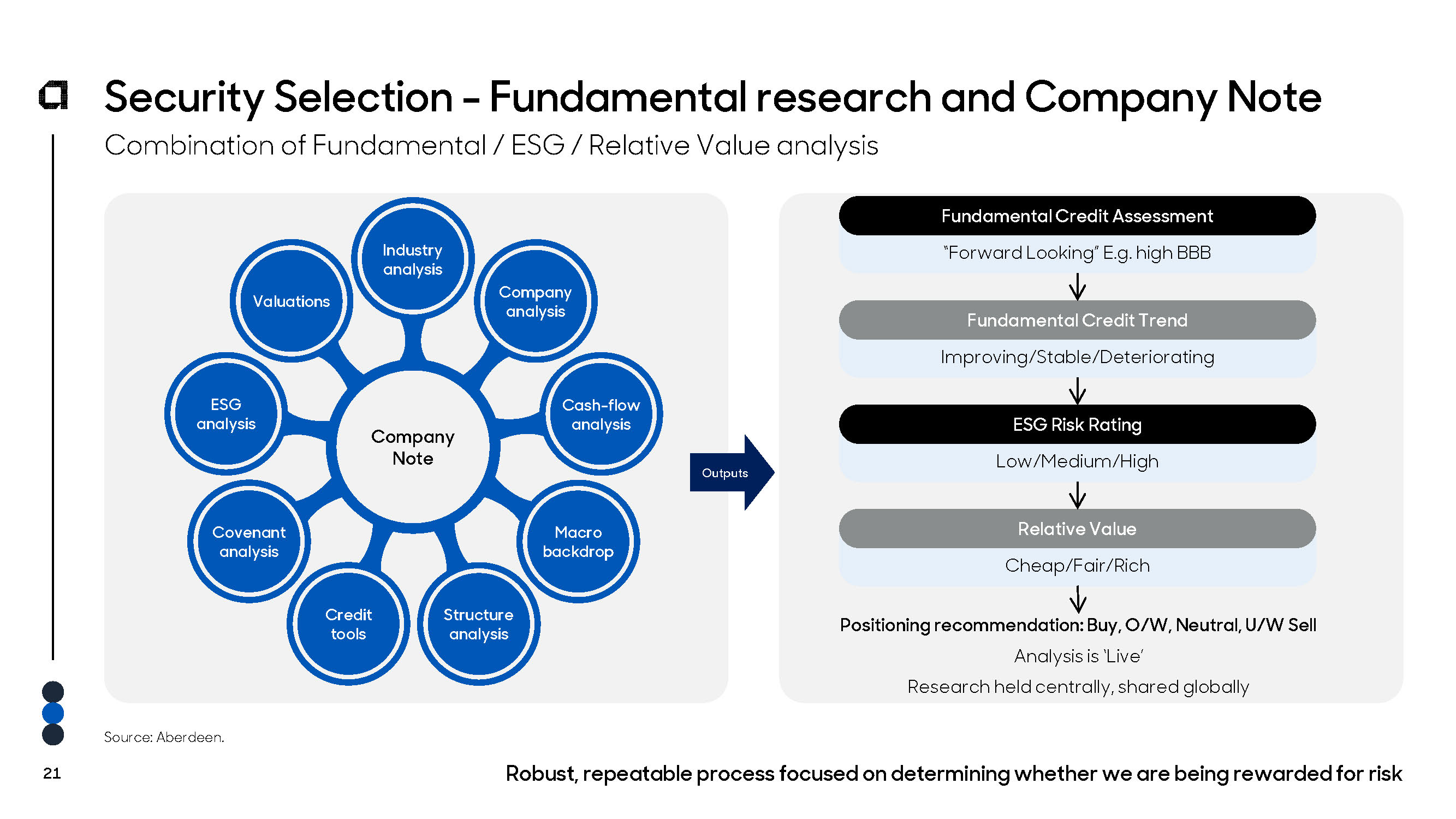 Security Selection - Fundamental research and Company Note Combination of Fundamental / ESG / Relative Value analysis Valuations Industry analysis Company analysis Cash-flow analysis Macro backdrop Structure analysis Credit tools Covenant analysis ESG analysis Fundamental Credit Assessment “Forward Looking” E.g. high BBB Fundamental Credit Trend Improving/Stable/Deteriorating ESG Risk Rating Low/Medium/High Relative Value Cheap/Fair/Rich Positioning recommendation: Buy, O/W, Neutral, U/W Sell Analysis is ‘Live’ Research held centrally, shared globally Source: Aberdeen. Robust, repeatable process focused on determining whether we are being rewarded for risk 21