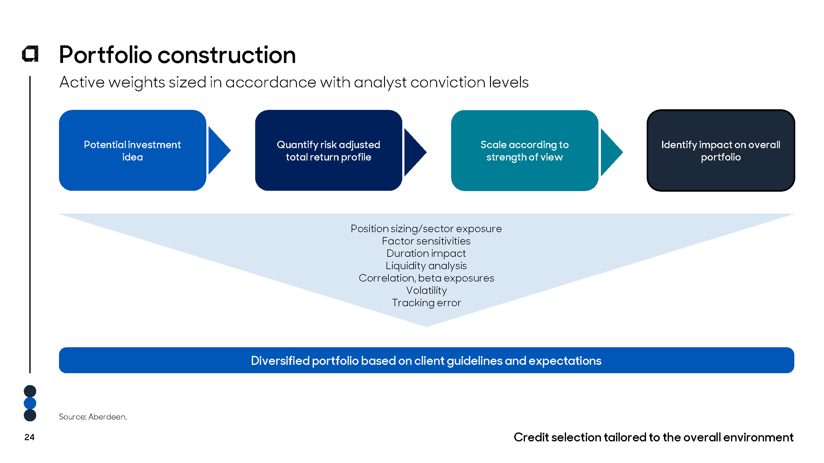 Portfolio construction Active weights sized in accordance with analyst conviction levels Potential investment idea Quantify risk adjusted total return profile Scale according to strength of view Identify impact on overall portfolio Position sizing/sector exposure Factor sensitivities Duration impact Liquidity analysis Correlation, beta exposures Volatility Tracking error Diversified portfolio based on client guidelines and expectations Source: Aberdeen. Credit selection tailored to the overall environment 24