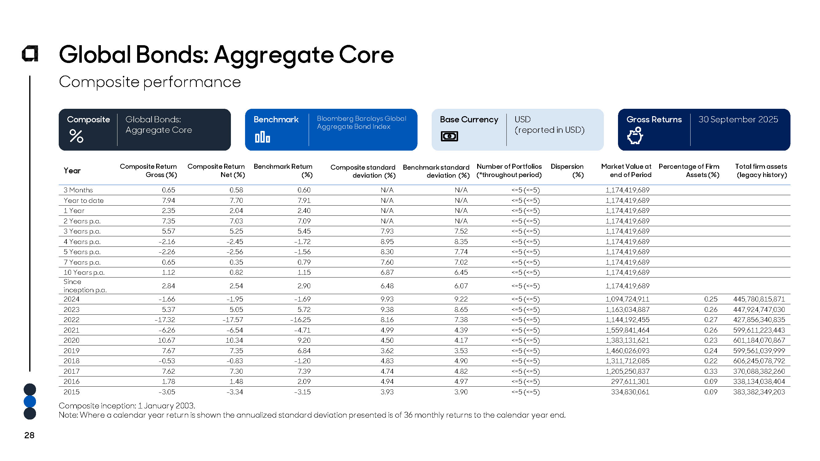 Global Bonds: Aggregate Core Composite performance Year Composite Return Gross (%) Composite Return Net (%) Benchmark Return (%) Composite standard deviation (%) Benchmark standard deviation (%) Number of Portfolios (*throughout period) Dispersion (%) Market Value at end of Period Percentage of Firm Assets (%) Total firm assets (legacy history) 3 Months 0.65 0.58 0.60 N/A N/A <=5 (<=5) 1,174,419,689 Year to date 7.94 7.70 7.91 N/A N/A <=5 (<=5) 1,174,419,689 1 Year 2.35 2.04 2.40 N/A N/A <=5 (<=5) 1,174,419,689 2 Years p.a. 7.35 7.03 7.09 N/A N/A <=5 (<=5) 1,174,419,689 3 Years p.a. 5.57 5.25 5.45 7.93 7.52 <=5 (<=5) 1,174,419,689 4 Years p.a. -2.16 -2.45 -1.72 8.95 8.35 <=5 (<=5) 1,174,419,689 5 Years p.a. -2.26 -2.56 -1.56 8.30 7.74 <=5 (<=5) 1,174,419,689 7 Years p.a. 0.65 0.35 0.79 7.60 7.02 <=5 (<=5) 1,174,419,689 10 Years p.a. 1.12 0.82 1.15 6.87 6.45 <=5 (<=5) 1,174,419,689 Since inception p.a. 2.84 2.54 2.90 6.48 6.07 <=5 (<=5) 1,174,419,689 2024 -1.66 -1.95 -1.69 9.93 9.22 <=5 (<=5) 1,094,724,911 0.25 445,780,815,871 2023 5.37 5.05 5.72 9.38 8.65 <=5 (<=5) 1,163,034,887 0.26 447,924,747,030 2022 -17.32 -17.57 -16.25 8.16 7.38 <=5 (<=5) 1,144,192,455 0.27 427,856,340,835 2021 -6.26 -6.54 -4.71 4.99 4.39 <=5 (<=5) 1,559,841,464 0.26 599,611,223,443 2020 10.67 10.34 9.20 4.50 4.17 <=5 (<=5) 1,383,131,621 0.23 601,184,070,867 2019 7.67 7.35 6.84 3.62 3.53 <=5 (<=5) 1,460,026,093 0.24 599,561,039,999 2018 -0.53 -0.83 -1.20 4.83 4.90 <=5 (<=5) 1,311,712,085 0.22 606,245,078,792 2017 7.62 7.30 7.39 4.74 4.82 <=5 (<=5) 1,205,250,837 0.33 370,088,382,260 2016 1.78 1.48 2.09 4.94 4.97 <=5 (<=5) 297,611,301 0.09 338,134,038,404 2015 -3.05 -3.34 -3.15 3.93 3.90 <=5 (<=5) 334,830,061 0.09 383,382,349,203 Composite inception: 1 January 2003. Note: Where a calendar year return is shown the annualized standard deviation presented is of 36 monthly returns to the calendar year end. 28