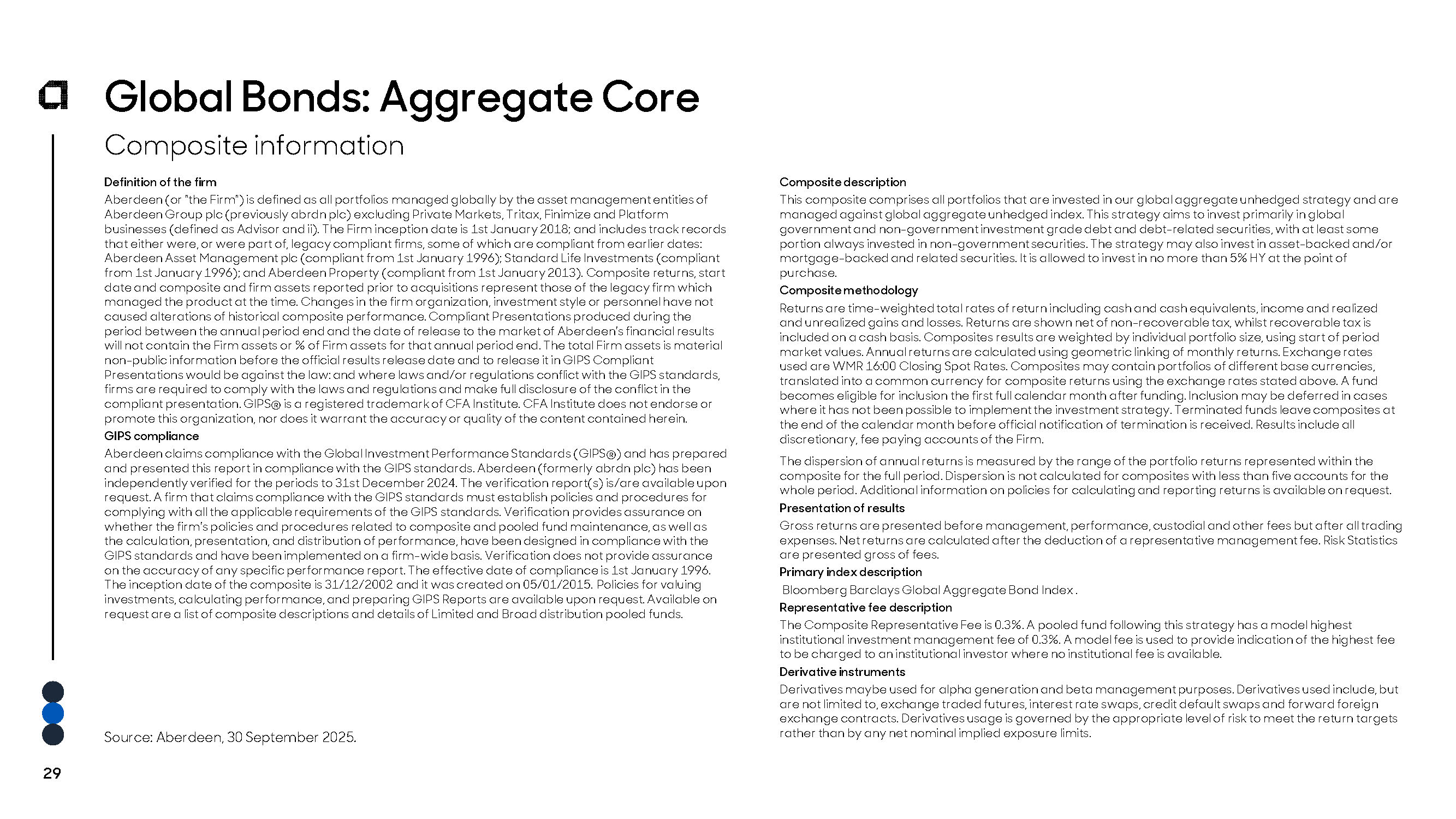 Global Bonds: Aggregate Core Composite information Definition of the firm Aberdeen (or "the Firm") is defined as all portfolios managed globally by the asset management entities of Aberdeen Group plc (previously abrdn plc) excluding Private Markets, Tritax, Finimize and Platform businesses (defined as Advisor and ii). The Firm inception date is 1st January 2018; and includes track records that either were, or were part of, legacy compliant firms, some of which are compliant from earlier dates: Aberdeen Asset Management plc (compliant from 1st January 1996); Standard Life Investments (compliant from 1st January 1996); and Aberdeen Property (compliant from 1st January 2013). Composite returns, start date and composite and firm assets reported prior to acquisitions represent those of the legacy firm which managed the product at the time. Changes in the firm organization, investment style or personnel have not caused alterations of historical composite performance. Compliant Presentations produced during the period between the annual period end and the date of release to the market of Aberdeen's financial results will not contain the Firm assets or % of Firm assets for that annual period end. The total Firm assets is material non-public information before the official results release date and to release it in GIPS Compliant Presentations would be against the law: and where laws and/or regulations conflict with the GIPS standards, firms are required to comply with the laws and regulations and make full disclosure of the conflict in the compliant presentation. GIPS® is a registered trademark of CFA Institute. CFA Institute does not endorse or promote this organization, nor does it warrant the accuracy or quality of the content contained herein. GIPS compliance Aberdeen claims compliance with the Global Investment Performance Standards (GIPS®) and has prepared and presented this report in compliance with the GIPS standards. Aberdeen (formerly abrdn plc) has been independently verified for the periods to 31st December 2024. The verification report(s) is/are available upon request. A firm that claims compliance with the GIPS standards must establish policies and procedures for complying with all the applicable requirements of the GIPS standards. Verification provides assurance on whether the firm's policies and procedures related to composite and pooled fund maintenance, as well as the calculation, presentation, and distribution of performance, have been designed in compliance with the GIPS standards and have been implemented on a firm-wide basis. Verification does not provide assurance on the accuracy of any specific performance report. The effective date of compliance is 1st January 1996. The inception date of the composite is 31/12/2002 and it was created on 05/01/2015. Policies for valuing investments, calculating performance, and preparing GIPS Reports are available upon request. Available on request are a list of composite descriptions and details of Limited and Broad distribution pooled funds. Source: Aberdeen, 30 September 2025. Composite description This composite comprises all portfolios that are invested in our global aggregate unhedged strategy and are managed against global aggregate unhedged index. This strategy aims to invest primarily in global government and non-government investment grade debt and debt-related securities, with at least some portion always invested in non-government securities. The strategy may also invest in asset-backed and/or mortgage-backed and related securities. It is allowed to invest in no more than 5% HY at the point of purchase. Composite methodology Returns are time-weighted total rates of return including cash and cash equivalents, income and realized and unrealized gains and losses. Returns are shown net of non-recoverable tax, whilst recoverable tax is included on a cash basis. Composites results are weighted by individual portfolio size, using start of period market values. Annual returns are calculated using geometric linking of monthly returns. Exchange rates used are WMR 16:00 Closing Spot Rates. Composites may contain portfolios of different base currencies, translated into a common currency for composite returns using the exchange rates stated above. A fund becomes eligible for inclusion the first full calendar month after funding. Inclusion may be deferred in cases where it has not been possible to implement the investment strategy. Terminated funds leave composites at the end of the calendar month before official notification of termination is received. Results include all discretionary, fee paying accounts of the Firm. The dispersion of annual returns is measured by the range of the portfolio returns represented within the composite for the full period. Dispersion is not calculated for composites with less than five accounts for the whole period. Additional information on policies for calculating and reporting returns is available on request. Presentation of results Gross returns are presented before management, performance, custodial and other fees but after all trading expenses. Net returns are calculated after the deduction of a representative management fee. Risk Statistics are presented gross of fees. Primary index description Bloomberg Barclays Global Aggregate Bond Index . Representative fee description The Composite Representative Fee is 0.3%. A pooled fund following this strategy has a model highest institutional investment management fee of 0.3%. A model fee is used to provide indication of the highest fee to be charged to an institutional investor where no institutional fee is available. Derivative instruments Derivatives maybe used for alpha generation and beta management purposes. Derivatives used include, but are not limited to, exchange traded futures, interest rate swaps, credit default swaps and forward foreign exchange contracts. Derivatives usage is governed by the appropriate level of risk to meet the return targets ra