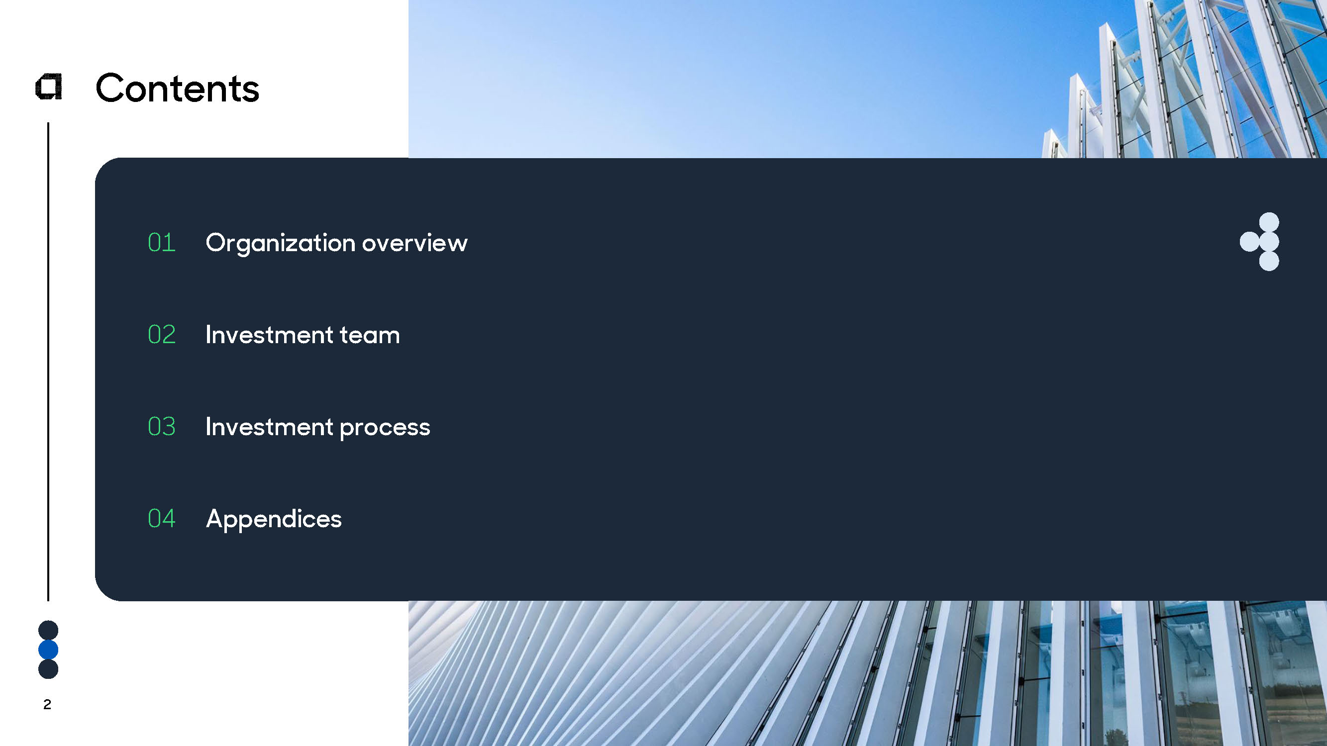 Contents 01 Organization overview 02 Investment team 03 Investment process 04 Appendices 2