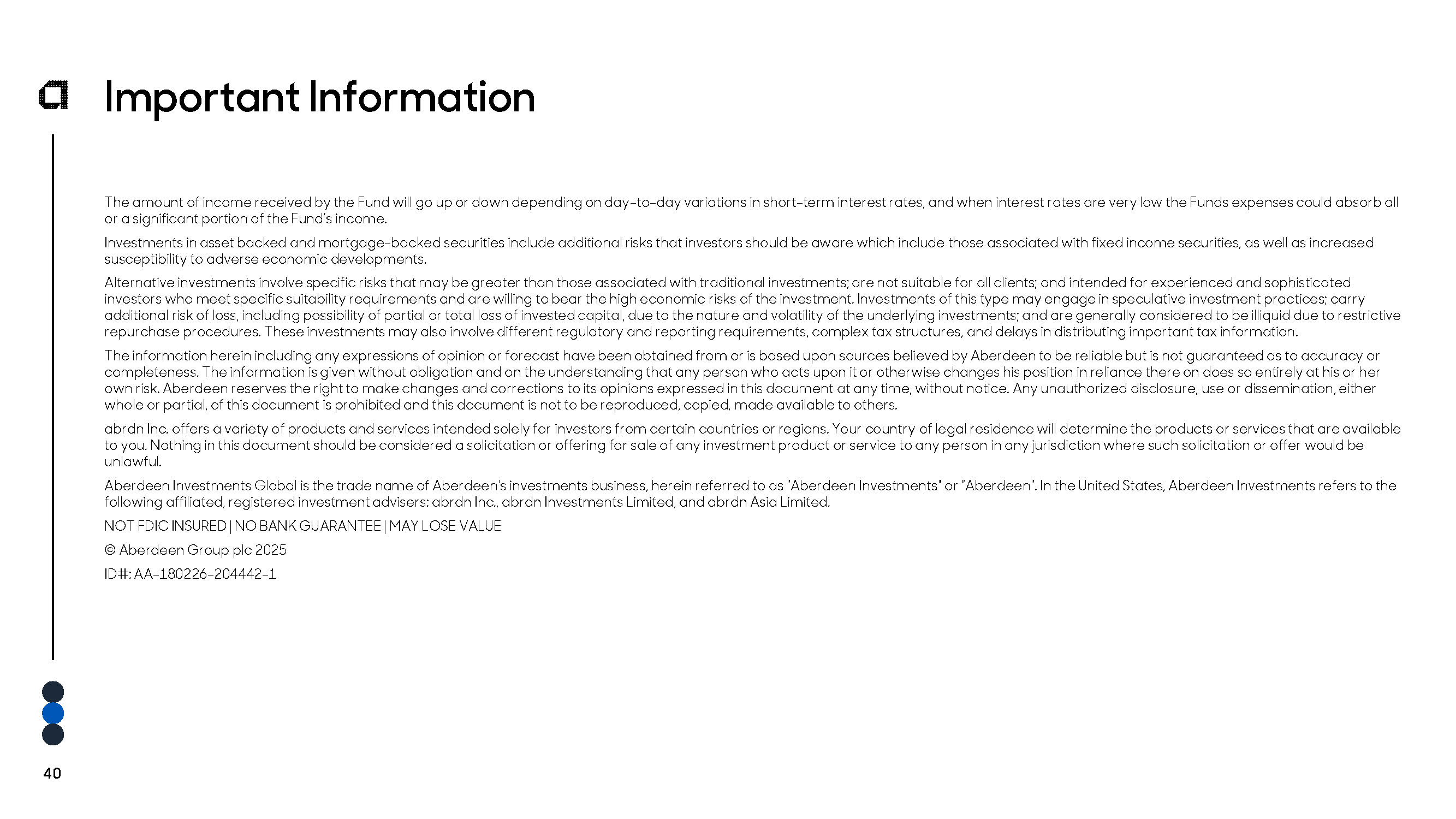 Important Information The amount of income received by the Fund will go up or down depending on day-to-day variations in short-term interest rates, and when interest rates are very low the Funds expenses could absorb all or a significant portion of the Fund’s income. Investments in asset backed and mortgage-backed securities include additional risks that investors should be aware which include those associated with fixed income securities, as well as increased susceptibility to adverse economic developments. Alternative investments involve specific risks that may be greater than those associated with traditional investments; are not suitable for all clients; and intended for experienced and sophisticated investors who meet specific suitability requirements and are willing to bear the high economic risks of the investment. Investments of this type may engage in speculative investment practices; carry additional risk of loss, including possibility of partial or total loss of invested capital, due to the nature and volatility of the underlying investments; and are generally considered to be illiquid due to restrictive repurchase procedures. These investments may also involve different regulatory and reporting requirements, complex tax structures, and delays in distributing important tax information. The information herein including any expressions of opinion or forecast have been obtained from or is based upon sources believed by Aberdeen to be reliable but is not guaranteed as to accuracy or completeness. The information is given without obligation and on the understanding that any person who acts upon it or otherwise changes his position in reliance there on does so entirely at his or her own risk. Aberdeen reserves the right to make changes and corrections to its opinions expressed in this document at any time, without notice. Any unauthorized disclosure, use or dissemination, either whole or partial, of this document is prohibited and this document is not to be reproduced, copied, made available to others. abrdn Inc. offers a variety of products and services intended solely for investors from certain countries or regions. Your country of legal residence will determine the products or services that are available to you. Nothing in this document should be considered a solicitation or offering for sale of any investment product or service to any person in any jurisdiction where such solicitation or offer would be unlawful. Aberdeen Investments Global is the trade name of Aberdeen's investments business, herein referred to as "Aberdeen Investments" or "Aberdeen". In the United States, Aberdeen Investments refers to the following affiliated, registered investment advisers: abrdn Inc., abrdn Investments Limited, and abrdn Asia Limited. NOT FDIC INSURED | NO BANK GUARANTEE | MAY LOSE VALUE © Aberdeen Group plc 2025 ID#: AA-180226-204442-1 40