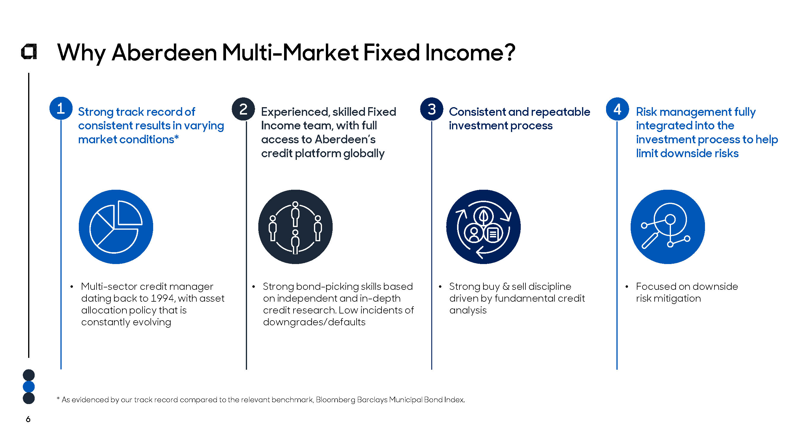 About us Our spirit is our strength By harnessing our knowledge and focusing on our core strengths, we can deliver for our clients. Aberdeen Investments is a global specialist asset manager Source: Aberdeen, 30 September 2025. Figures may appear not to add due to rounding. *Environmental, Social & Governance. USD515bn AUM >600 Investment professionals >25 Locations Worldwide Who we are Specialist in unique strategies Including emerging markets, Asia, sustainability, fund finance; European real estate & infrastructure Our clients Institutional Sovereign wealth funds, pensions, insurance, charities & foundations Wholesale Retail, platforms, high net worth Delivering across asset class ESG* analysis and considerations as part of the investment process Global fixed income AUM USD175bn • Developed markets and global credit • Emerging markets and Asia • Private credit • Money markets • Government Specialist equities AUM USD71bn • Global • Emerging markets & Asia • Developed markets • Small/Midcap • Thematics Multi-asset AUM USD181bn • Multi manager • Index solutions • Multi-asset insurance • Multi-asset institutional/retail • Quantitative Index Solutions (QIS) • Private market solutions Alternatives AUM USD33bn • Hedge funds • Commodities Real assets AUM USD55bn • Real estate • Infrastructure 5