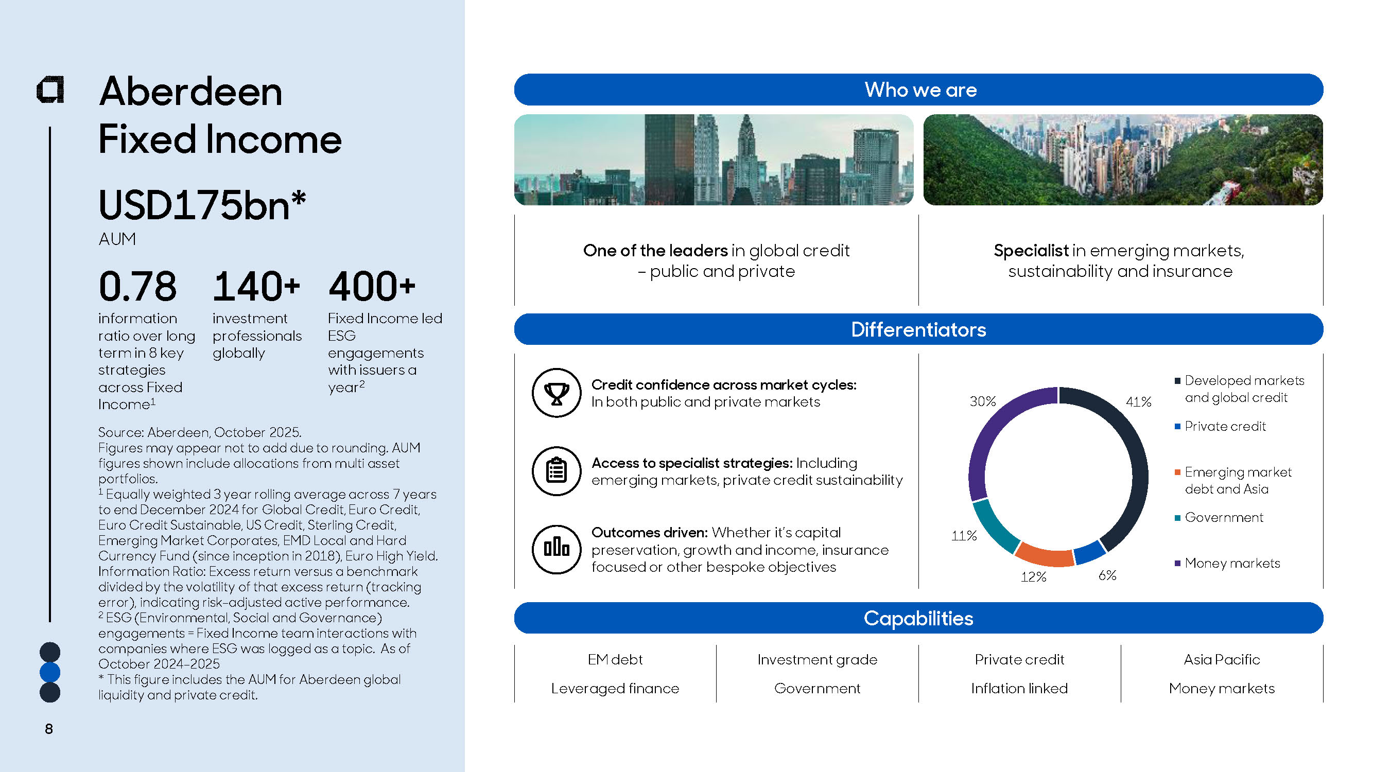 Aberdeen Fixed Income USD175bn* AUM 0.78 information ratio over long term in 8 key strategies across Fixed Income1 400+ Fixed Income led ESG engagements with issuers a year2 140+ investment professionals globally Source: Aberdeen, October 2025. Figures may appear not to add due to rounding. AUM figures shown include allocations from multi asset portfolios. 1 Equally weighted 3 year rolling average across 7 years to end December 2024 for Global Credit, Euro Credit, Euro Credit Sustainable, US Credit, Sterling Credit, Emerging Market Corporates, EMD Local and Hard Currency Fund (since inception in 2018), Euro High Yield. Information Ratio: Excess return versus a benchmark divided by the volatility of that excess return (tracking error), indicating risk-adjusted active performance. 2 ESG (Environmental, Social and Governance) engagements = Fixed Income team interactions with companies where ESG was logged as a topic. As of October 2024-2025 * This figure includes the AUM for Aberdeen global liquidity and private credit. Who we are One of the leaders in global credit – public and private Specialist in emerging markets, sustainability and insurance Differentiators Credit confidence across market cycles: In both public and private markets Access to specialist strategies: Including emerging markets, private credit sustainability Outcomes driven: Whether it’s capital preservation, growth and income, insurance focused or other bespoke objectives 30% 41% 11% 12% 6% Developed markets and global credit Private credit Emerging market debt and Asia Government Money markets Capabilities EM debt Leveraged finance Investment grade Government Private credit Inflation linked Asia Pacific Money markets 8
