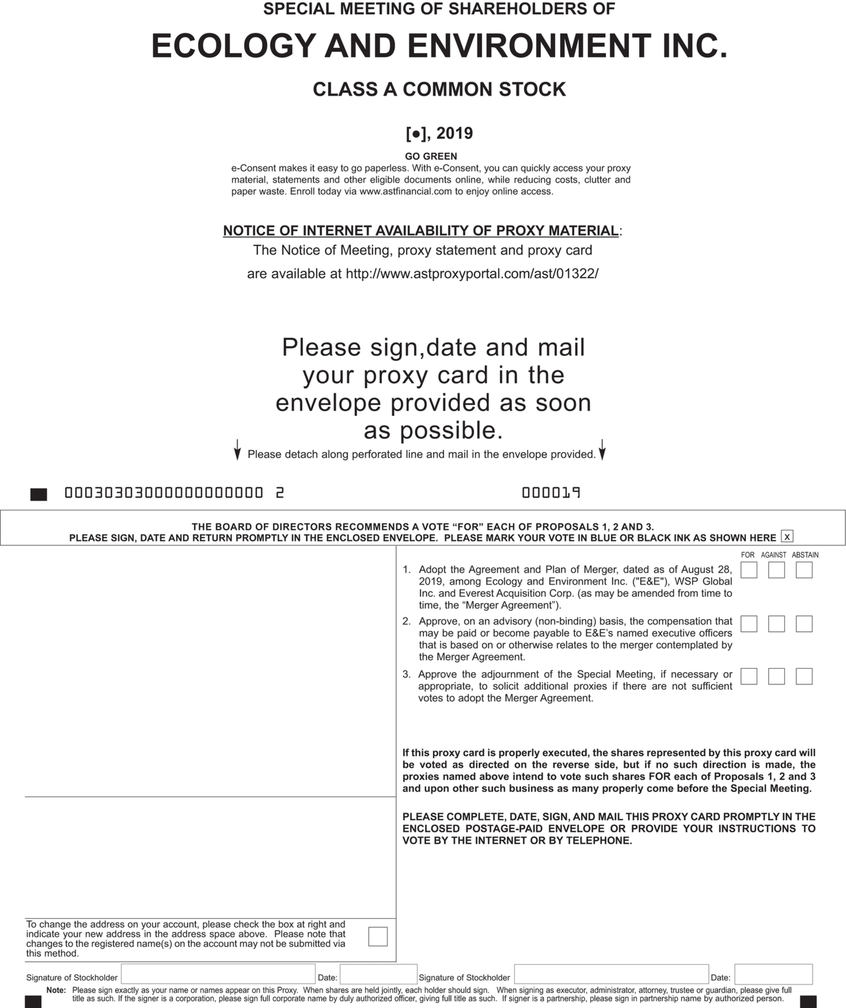 SPECIAL MEETING OF SHAREHOLDERS OF ECOLOGY AND ENVIRONMENT INC. CLASS A COMMON STOCK [●], 2019 NOTICE OF INTERNET AVAILABILITY OF PROXY MATERIAL: The Notice of Meeting, proxy statement and proxy card are available at http://www.astproxyportal.com/ast/01322/ Please sign,date and mail your proxy card in the envelope provided as soon as possible. Signature of Stockholder Date: Signature of Stockholder Date: Note: Please sign exactly as your name or names appear on this Proxy. When shares are held jointly, each holder should sign. When signing as executor, administrator, attorney, trustee or guardian, please give full title as such. If the signer is a corporation, please sign full corporate name by duly authorized officer, giving full title as such. If signer is a partnership, please sign in partnership name by authorized person. To change the address on your account, please check the box at right and indicate your new address in the address space above. Please note that changes to the registered name(s) on the account may not be submitted via this method. THE BOARD OF DIRECTORS RECOMMENDS A VOTE “FOR” EACH OF PROPOSALS 1, 2 AND 3. PLEASE SIGN, DATE AND RETURN PROMPTLY IN THE ENCLOSED ENVELOPE. PLEASE MARK YOUR VOTE IN BLUE OR BLACK INK AS SHOWN HERE x Please detach along perforated line and mail in the ------------------ e n v e l o p e p r o v i d e d . ---------------- 00030303000000000000 2 000019 GO GREEN e-Consent makes it easy to go paperless. With e-Consent, you can quickly access your proxy material, statements and other eligible documents online, while reducing costs, clutter and paper waste. Enroll today via www.astfinancial.com to enjoy online access. 1. Adopt the Agreement and Plan of Merger, dated as of August 28, 2019, among Ecology and Environment Inc. ("E&E"), WSP Global Inc. and Everest Acquisition Corp. (as may be amended from time to time, the “Merger Agreement”). 2. Approve, on an advisory (non-binding) basis, the compensation that may be paid or become payable to E&E’s named executive officers that is based on or otherwise relates to the merger contemplated by the Merger Agreement. 3. Approve the adjournment of the Special Meeting, if necessary or appropriate, to solicit additional proxies if there are not sufficient votes to adopt the Merger Agreement. If this proxy card is properly executed, the shares represented by this proxy card will be voted as directed on the reverse side, but if no such direction is made, the proxies named above intend to vote such shares FOR each of Proposals 1, 2 and 3 and upon other such business as many properly come before the Special Meeting. PLEASE COMPLETE, DATE, SIGN, AND MAIL THIS PROXY CARD PROMPTLY IN THE ENCLOSED POSTAGE-PAID ENVELOPE OR PROVIDE YOUR INSTRUCTIONS TO VOTE BY THE INTERNET OR BY TELEPHONE. FOR AGAINST ABSTAIN