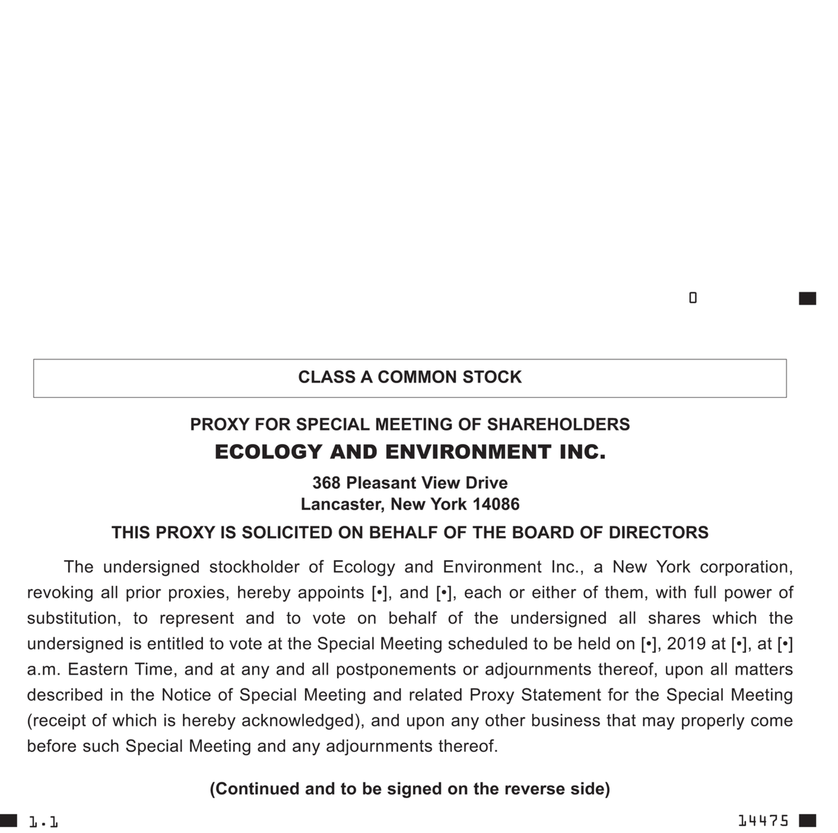 0 ------------------ . . . . . . . . . . . . . . . . . . . . . . . . . . . . . . . . . . . . . . . . . . . . . . . . . . . . . . ---------------- 14475 PROXY FOR SPECIAL MEETING OF SHAREHOLDERS ECOLOGY AND ENVIRONMENT INC. 368 Pleasant View Drive Lancaster, New York 14086 THIS PROXY IS SOLICITED ON BEHALF OF THE BOARD OF DIRECTORS The undersigned stockholder of Ecology and Environment Inc., a New York corporation, revoking all prior proxies, hereby appoints [•], and [•], each or either of them, with full power of substitution, to represent and to vote on behalf of the undersigned all shares which the undersigned is entitled to vote at the Special Meeting scheduled to be held on [•], 2019 at [•], at [•] a.m. Eastern Time, and at any and all postponements or adjournments thereof, upon all matters described in the Notice of Special Meeting and related Proxy Statement for the Special Meeting (receipt of which is hereby acknowledged), and upon any other business that may properly come before such Special Meeting and any adjournments thereof. (Continued and to be signed on the reverse side) CLASS A COMMON STOCK 1.1