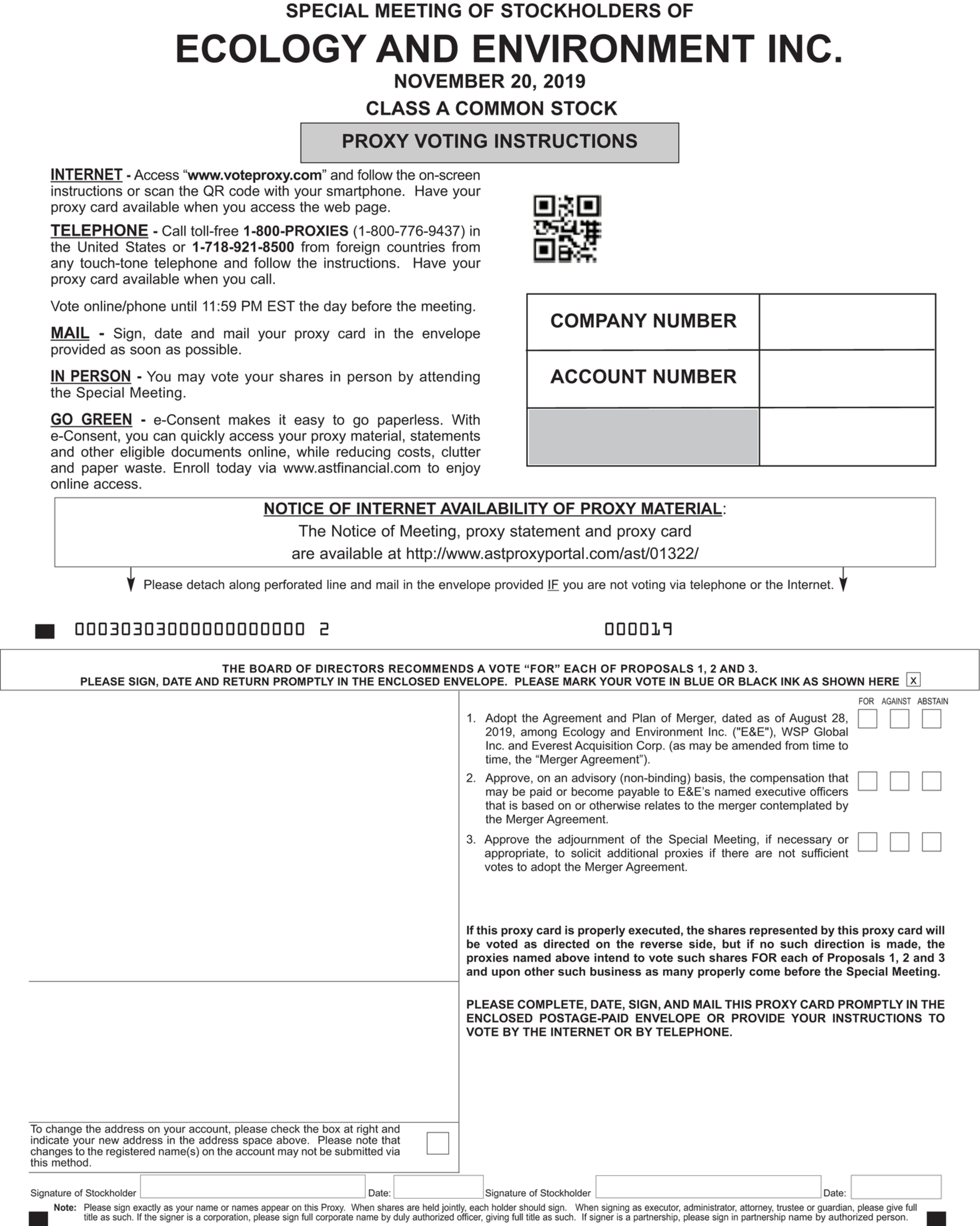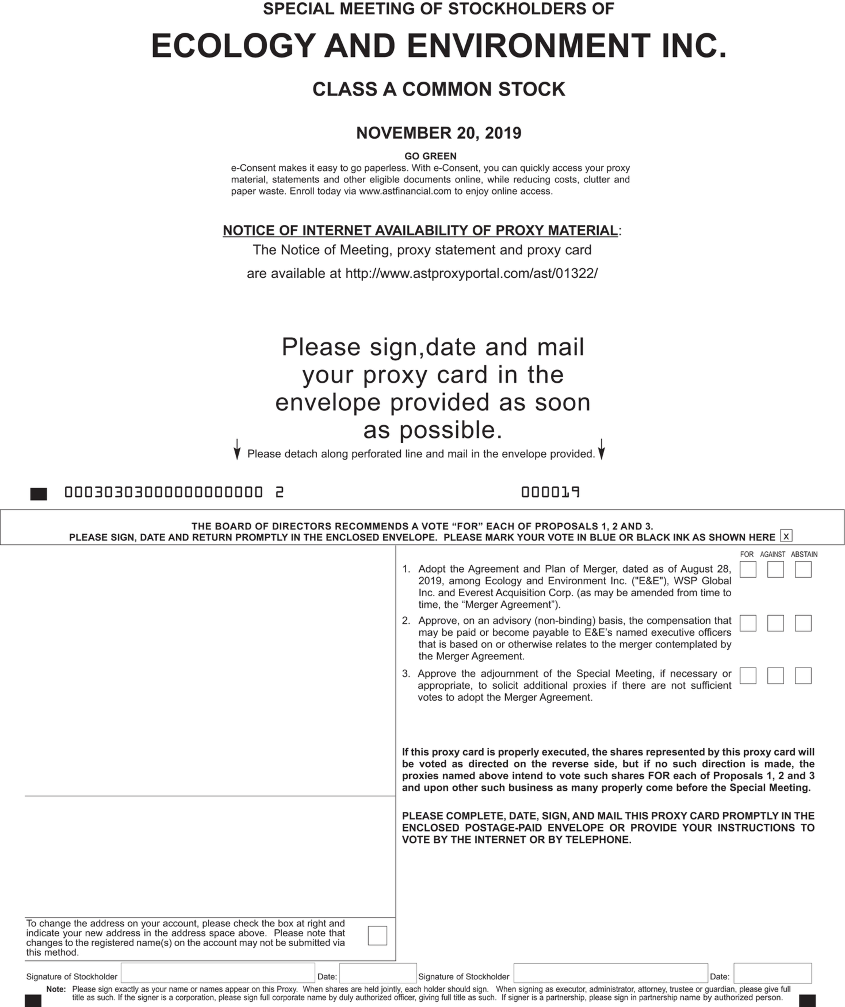 SPECIAL MEETING OF SHAREHOLDERS OF ECOLOGY AND ENVIRONMENT INC. CLASS A COMMON STOCK [●], 2019 NOTICE OF INTERNET AVAILABILITY OF PROXY MATERIAL: The Notice of Meeting, proxy statement and proxy card are available at http://www.astproxyportal.com/ast/01322/ Please sign,date and mail your proxy card in the envelope provided as soon as possible. Signature of Stockholder Date: Signature of Stockholder Date: Note: Please sign exactly as your name or names appear on this Proxy. When shares are held jointly, each holder should sign. When signing as executor, administrator, attorney, trustee or guardian, please give full title as such. If the signer is a corporation, please sign full corporate name by duly authorized officer, giving full title as such. If signer is a partnership, please sign in partnership name by authorized person. To change the address on your account, please check the box at right and indicate your new address in the address space above. Please note that changes to the registered name(s) on the account may not be submitted via this method. THE BOARD OF DIRECTORS RECOMMENDS A VOTE “FOR” EACH OF PROPOSALS 1, 2 AND 3. PLEASE SIGN, DATE AND RETURN PROMPTLY IN THE ENCLOSED ENVELOPE. PLEASE MARK YOUR VOTE IN BLUE OR BLACK INK AS SHOWN HERE x Please detach along perforated line and mail in the ------------------ e n v e l o p e p r o v i d e d . ---------------- 00030303000000000000 2 000019 GO GREEN e-Consent makes it easy to go paperless. With e-Consent, you can quickly access your proxy material, statements and other eligible documents online, while reducing costs, clutter and paper waste. Enroll today via www.astfinancial.com to enjoy online access. 1. Adopt the Agreement and Plan of Merger, dated as of August 28, 2019, among Ecology and Environment Inc. ("E&E"), WSP Global Inc. and Everest Acquisition Corp. (as may be amended from time to time, the “Merger Agreement”). 2. Approve, on an advisory (non-binding) basis, the compensation that may be paid or become payable to E&E’s named executive officers that is based on or otherwise relates to the merger contemplated by the Merger Agreement. 3. Approve the adjournment of the Special Meeting, if necessary or appropriate, to solicit additional proxies if there are not sufficient votes to adopt the Merger Agreement. If this proxy card is properly executed, the shares represented by this proxy card will be voted as directed on the reverse side, but if no such direction is made, the proxies named above intend to vote such shares FOR each of Proposals 1, 2 and 3 and upon other such business as many properly come before the Special Meeting. PLEASE COMPLETE, DATE, SIGN, AND MAIL THIS PROXY CARD PROMPTLY IN THE ENCLOSED POSTAGE-PAID ENVELOPE OR PROVIDE YOUR INSTRUCTIONS TO VOTE BY THE INTERNET OR BY TELEPHONE. FOR AGAINST ABSTAIN