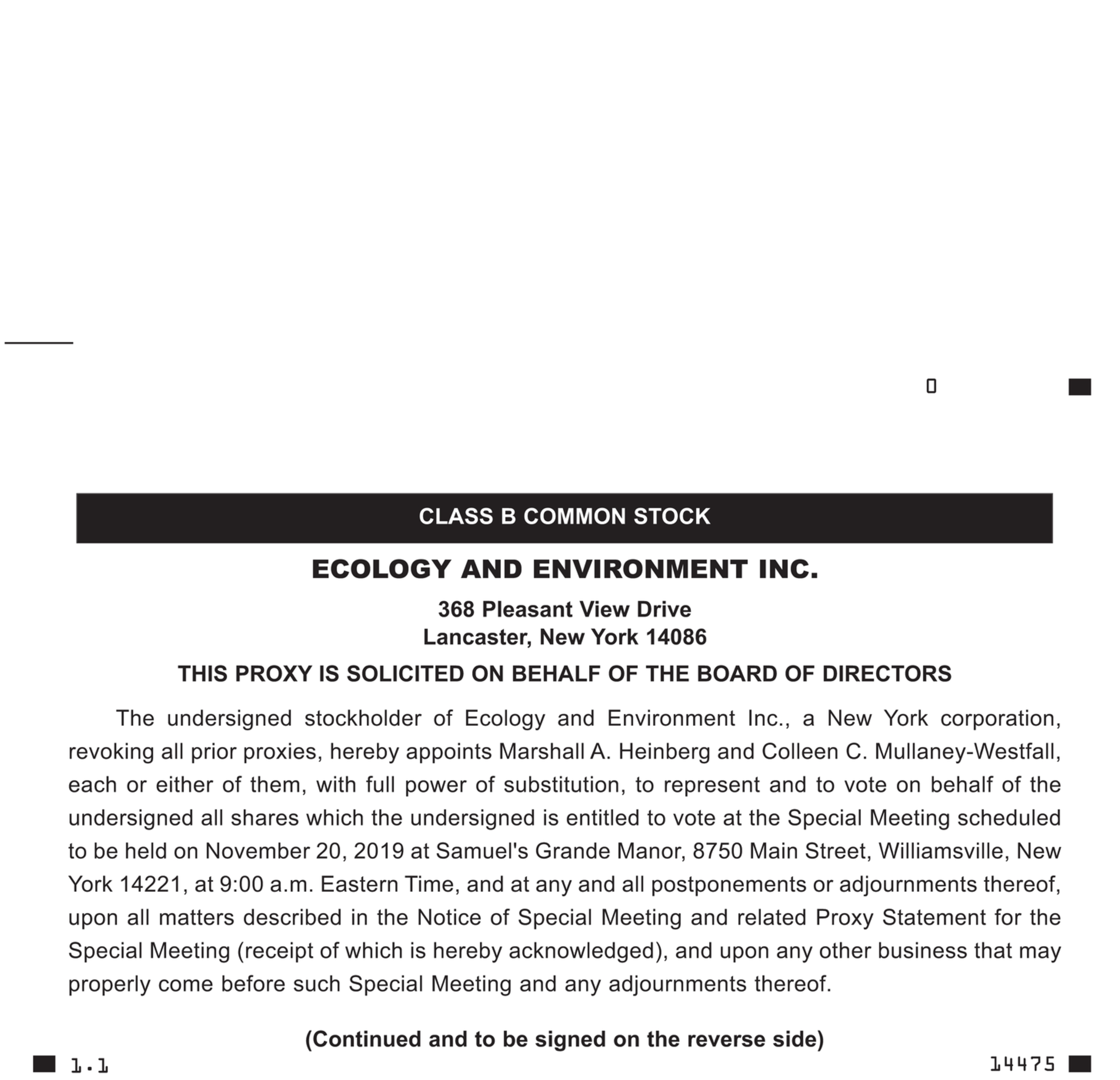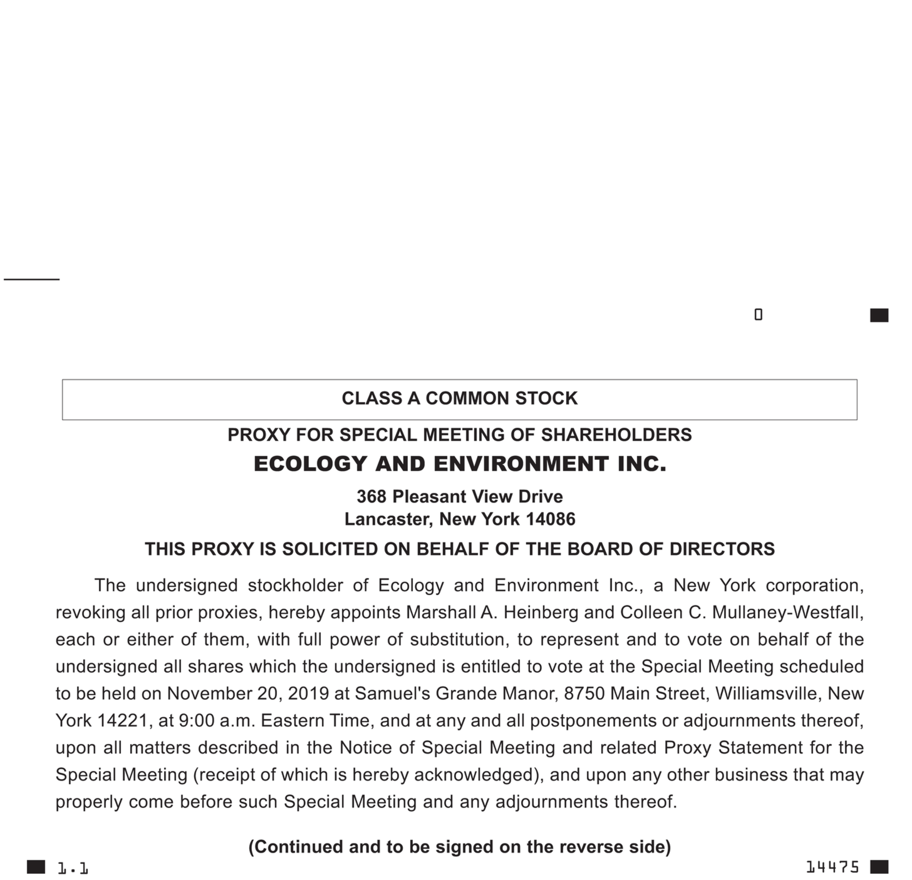 0 ------------------ . . . . . . . . . . . . . . . . . . . . . . . . . . . . . . . . . . . . . . . . . . . . . . . . . . . . . . ---------------- 14475 PROXY FOR SPECIAL MEETING OF SHAREHOLDERS ECOLOGY AND ENVIRONMENT INC. 368 Pleasant View Drive Lancaster, New York 14086 THIS PROXY IS SOLICITED ON BEHALF OF THE BOARD OF DIRECTORS The undersigned stockholder of Ecology and Environment Inc., a New York corporation, revoking all prior proxies, hereby appoints [•], and [•], each or either of them, with full power of substitution, to represent and to vote on behalf of the undersigned all shares which the undersigned is entitled to vote at the Special Meeting scheduled to be held on [•], 2019 at [•], at [•] a.m. Eastern Time, and at any and all postponements or adjournments thereof, upon all matters described in the Notice of Special Meeting and related Proxy Statement for the Special Meeting (receipt of which is hereby acknowledged), and upon any other business that may properly come before such Special Meeting and any adjournments thereof. (Continued and to be signed on the reverse side) CLASS A COMMON STOCK 1.1