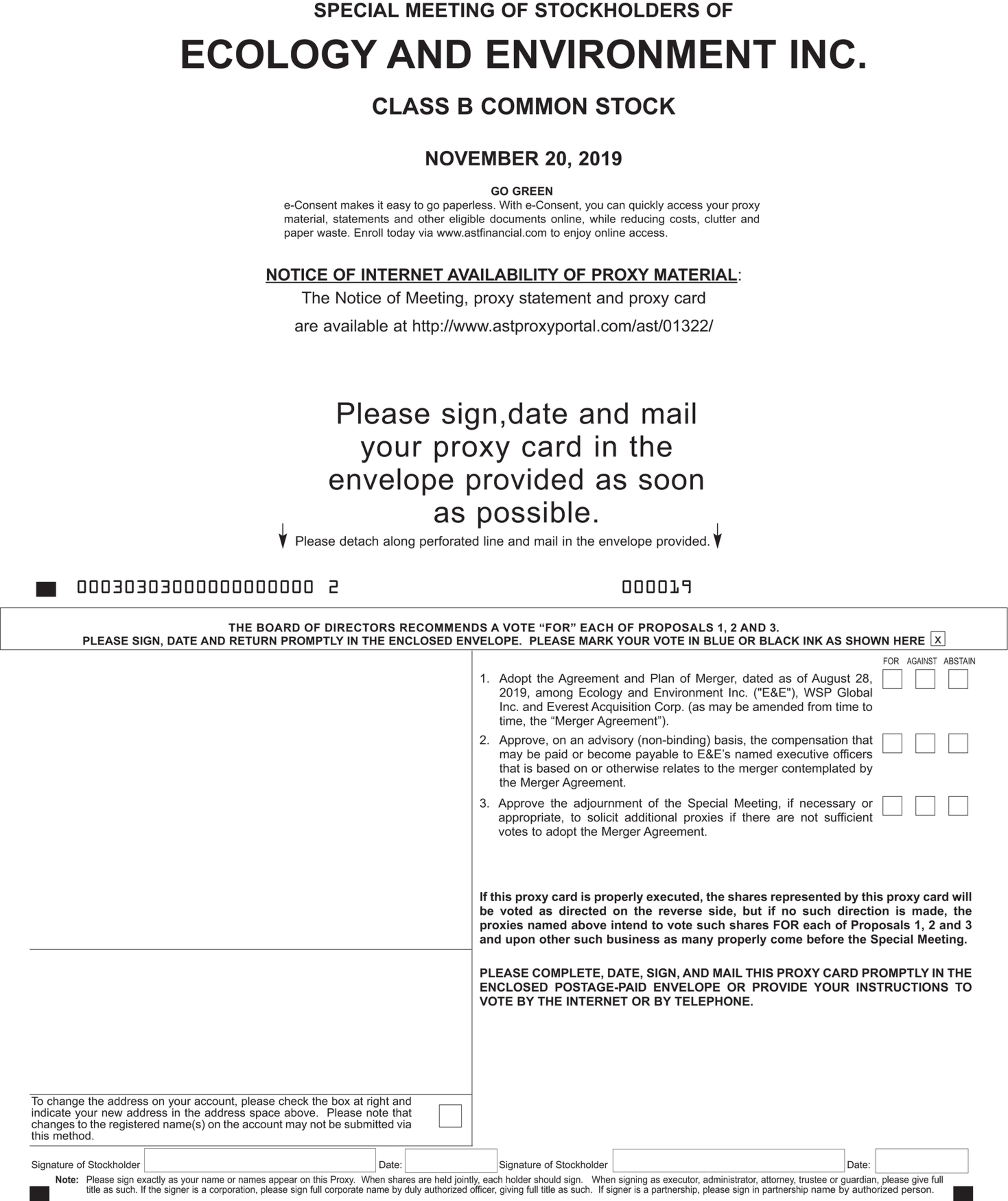 SPECIAL MEETING OF SHAREHOLDERS OF ECOLOGY AND ENVIRONMENT INC. CLASS B COMMON STOCK [●], 2019 NOTICE OF INTERNET AVAILABILITY OF PROXY MATERIAL: The Notice of Meeting, proxy statement and proxy card are available at http://www.astproxyportal.com/ast/01322/ Please sign,date and mail your proxy card in the envelope provided as soon as possible. Signature of Stockholder Date: Signature of Stockholder Date: Note: Please sign exactly as your name or names appear on this Proxy. When shares are held jointly, each holder should sign. When signing as executor, administrator, attorney, trustee or guardian, please give full title as such. If the signer is a corporation, please sign full corporate name by duly authorized officer, giving full title as such. If signer is a partnership, please sign in partnership name by authorized person. To change the address on your account, please check the box at right and indicate your new address in the address space above. Please note that changes to the registered name(s) on the account may not be submitted via this method. THE BOARD OF DIRECTORS RECOMMENDS A VOTE “FOR” EACH OF PROPOSALS 1, 2 AND 3. PLEASE SIGN, DATE AND RETURN PROMPTLY IN THE ENCLOSED ENVELOPE. PLEASE MARK YOUR VOTE IN BLUE OR BLACK INK AS SHOWN HERE x Please detach along perforated line and mail in the ------------------ e n v e l o p e p r o v i d e d . ---------------- 00030303000000000000 2 000019 GO GREEN e-Consent makes it easy to go paperless. With e-Consent, you can quickly access your proxy material, statements and other eligible documents online, while reducing costs, clutter and paper waste. Enroll today via www.astfinancial.com to enjoy online access. 1. Adopt the Agreement and Plan of Merger, dated as of August 28, 2019, among Ecology and Environment Inc. ("E&E"), WSP Global Inc. and Everest Acquisition Corp. (as may be amended from time to time, the “Merger Agreement”). 2. Approve, on an advisory (non-binding) basis, the compensation that may be paid or become payable to E&E’s named executive officers that is based on or otherwise relates to the merger contemplated by the Merger Agreement. 3. Approve the adjournment of the Special Meeting, if necessary or appropriate, to solicit additional proxies if there are not sufficient votes to adopt the Merger Agreement. If this proxy card is properly executed, the shares represented by this proxy card will be voted as directed on the reverse side, but if no such direction is made, the proxies named above intend to vote such shares FOR each of Proposals 1, 2 and 3 and upon other such business as many properly come before the Special Meeting. PLEASE COMPLETE, DATE, SIGN, AND MAIL THIS PROXY CARD PROMPTLY IN THE ENCLOSED POSTAGE-PAID ENVELOPE OR PROVIDE YOUR INSTRUCTIONS TO VOTE BY THE INTERNET OR BY TELEPHONE. FOR AGAINST ABSTAIN