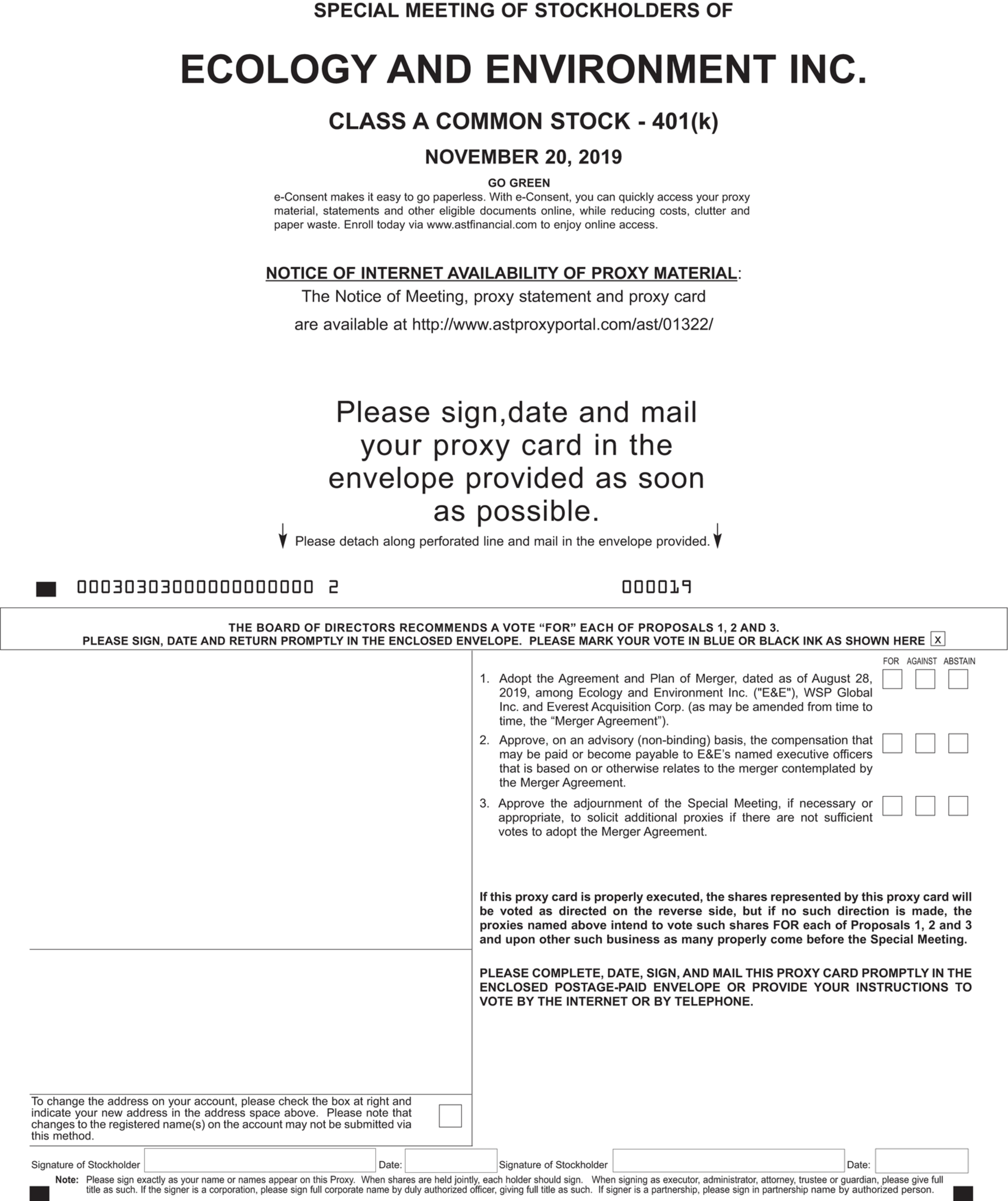 SPECIAL MEETING OF SHAREHOLDERS OF ECOLOGY AND ENVIRONMENT INC. CLASS A COMMON STOCK 401 (k) [●], 2019 NOTICE OF INTERNET AVAILABILITY OF PROXY MATERIAL: The Notice of Meeting, proxy statement and proxy card are available at http://www.astproxyportal.com/ast/01322/ Please sign,date and mail your proxy card in the envelope provided as soon as possible. Signature of Stockholder Date: Signature of Stockholder Date: Note: Please sign exactly as your name or names appear on this Proxy. When shares are held jointly, each holder should sign. When signing as executor, administrator, attorney, trustee or guardian, please give full title as such. If the signer is a corporation, please sign full corporate name by duly authorized officer, giving full title as such. If signer is a partnership, please sign in partnership name by authorized person. To change the address on your account, please check the box at right and indicate your new address in the address space above. Please note that changes to the registered name(s) on the account may not be submitted via this method. THE BOARD OF DIRECTORS RECOMMENDS A VOTE “FOR” EACH OF PROPOSALS 1, 2 AND 3. PLEASE SIGN, DATE AND RETURN PROMPTLY IN THE ENCLOSED ENVELOPE. PLEASE MARK YOUR VOTE IN BLUE OR BLACK INK AS SHOWN HERE x Please detach along perforated line and mail in the ------------------ e n v e l o p e p r o v i d e d . ---------------- 00030303000000000000 2 000019 GO GREEN e-Consent makes it easy to go paperless. With e-Consent, you can quickly access your proxy material, statements and other eligible documents online, while reducing costs, clutter and paper waste. Enroll today via www.astfinancial.com to enjoy online access. 1. Adopt the Agreement and Plan of Merger, dated as of August 28, 2019, among Ecology and Environment Inc. ("E&E"), WSP Global Inc. and Everest Acquisition Corp. (as may be amended from time to time, the “Merger Agreement”). 2. Approve, on an advisory (non-binding) basis, the compensation that may be paid or become payable to E&E’s named executive officers that is based on or otherwise relates to the merger contemplated by the Merger Agreement. 3. Approve the adjournment of the Special Meeting, if necessary or appropriate, to solicit additional proxies if there are not sufficient votes to adopt the Merger Agreement. If this proxy card is properly executed, the shares represented by this proxy card will be voted as directed on the reverse side, but if no such direction is made, the proxies named above intend to vote such shares FOR each of Proposals 1, 2 and 3 and upon other such business as many properly come before the Special Meeting. PLEASE COMPLETE, DATE, SIGN, AND MAIL THIS PROXY CARD PROMPTLY IN THE ENCLOSED POSTAGE-PAID ENVELOPE OR PROVIDE YOUR INSTRUCTIONS TO VOTE BY THE INTERNET OR BY TELEPHONE. FOR AGAINST ABSTAIN