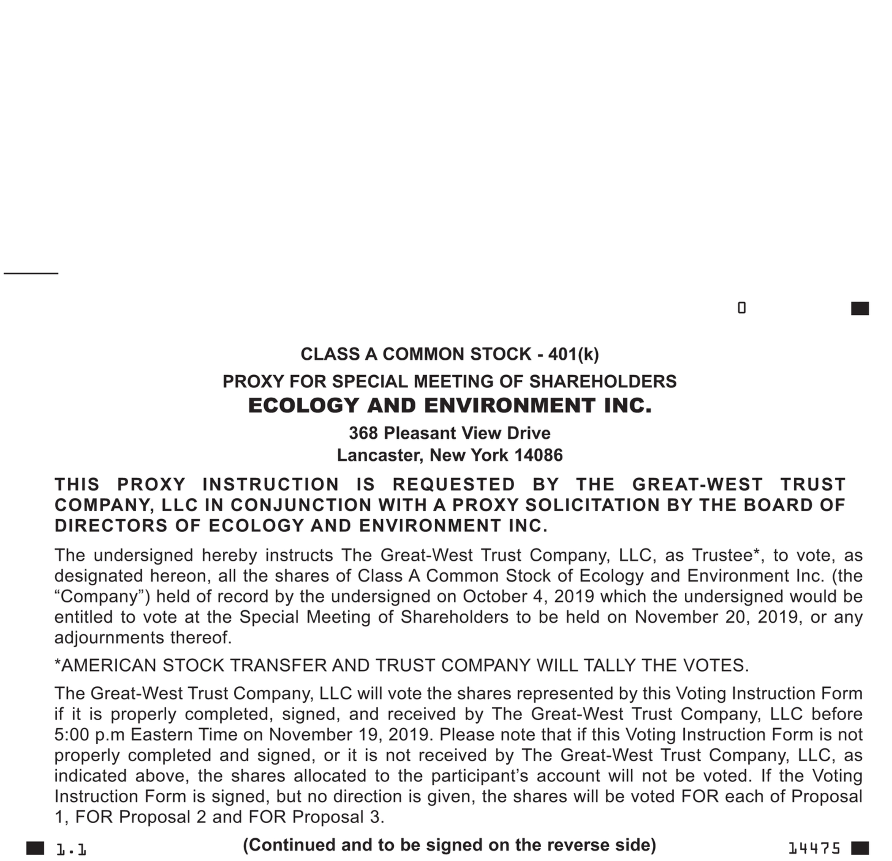 0 ------------------ . . . . . . . . . . . . . . . . . . . . . . . . . . . . . . . . . . . . . . . . . . . . . . . . . . . . . . ---------------- 14475 CLASS A COMMON STOCK - 401(k) PROXY FOR SPECIAL MEETING OF SHAREHOLDERS ECOLOGY AND ENVIRONMENT INC. 368 Pleasant View Drive Lancaster, New York 14086 THIS PROXY INSTRUCTION IS REQUESTED BY THE GREAT-WEST TRUST COMPANY, LLC IN CONJUNCTION WITH A PROXY SOLICITATION BY THE BOARD OF DIRECTORS OF ECOLOGY AND ENVIRONMENT INC. The undersigned hereby instructs The Great-West Trust Company, LLC, as Trustee*, to vote, as designated hereon, all the shares of Class A Common Stock of Ecology and Environment Inc. (the “Company”) held of record by the undersigned on [●], 2019 which the undersigned would be entitled to vote at the Special Meeting of Shareholders to be held on [●], 2019, or any adjournments thereof. *AMERICAN STOCK TRANSFER AND TRUST COMPANY WILL TALLY THE VOTES. The Great-West Trust Company, LLC will vote the shares represented by this Voting Instruction Form if it is properly completed, signed, and received by The Great-West Trust Company, LLC before [●] p.m. EST on [●], 2019. Please note that if this Voting Instruction Form is not properly completed and signed, or it is not received by The Great-West Trust Company, LLC, as indicated above, the shares allocated to the participant’s account will not be voted. If the Voting Instruction Form is signed, but no direction is given, the shares will be voted FOR each of Proposal 1, FOR Proposal 2 and FOR Proposal 3. (Continued and to be signed on 1.1 the reverse side)