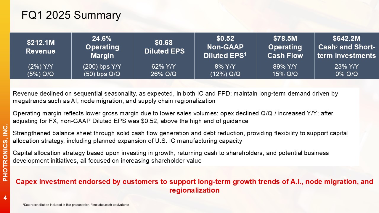 FQ1 2025 Summary Capex investment endorsed by customers to support long-term growth