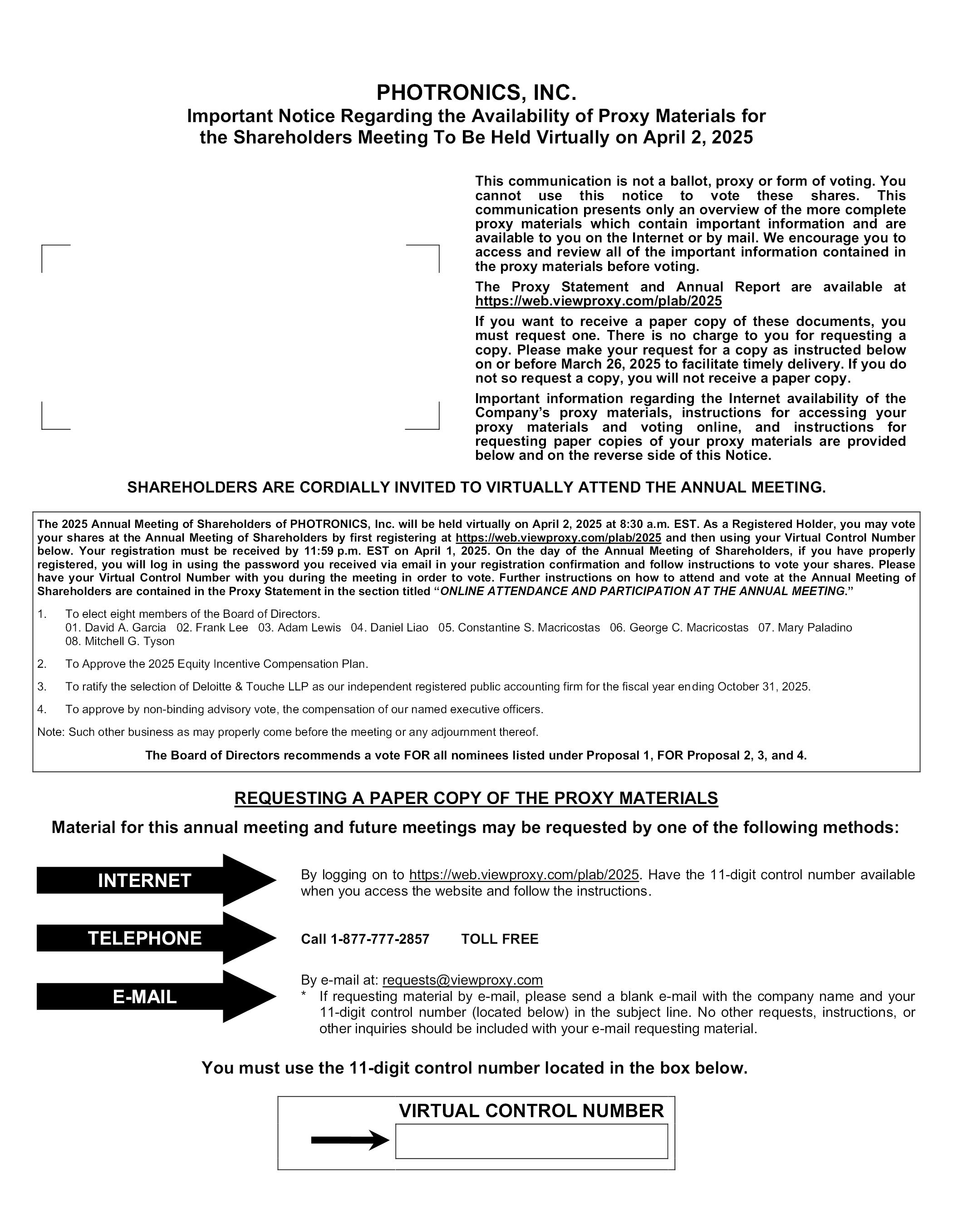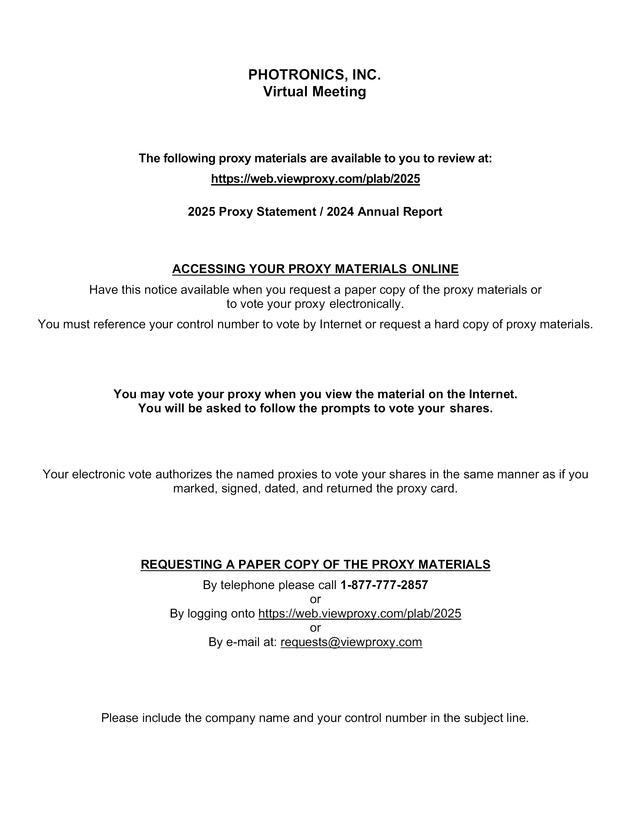 PHOTRONICS, INC. Virtual Meeting The following proxy materials are available to you to review at: https://web.viewproxy.com/plab/2025 2025 Proxy Statement / 2024 Annual Report ACCESSING YOUR PROXY MATERIALS ONLINE Have this notice available when you request a paper copy of the proxy materials or to vote your proxy electronically. You must reference your control number to vote by Internet or request a hard copy of proxy materials. You may vote your proxy when you view the material on the Internet. You will be asked to follow the prompts to vote your shares. Your electronic vote authorizes the named proxies to vote your shares in the same manner as if you marked, signed, dated, and returned the proxy card. REQUESTING A PAPER COPY OF THE PROXY MATERIALS By telephone please call 1-877-777-2857 or By logging onto https://web.viewproxy.com/plab/2025 or By e-mail at: requests@viewproxy.com Please include the company name and your control number in the subject line.