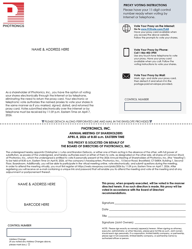 NAME & ADDRESS HERE BARCODE HERE PLEASE DETACH ALONG PERFORATED LINE AND MAIL IN THE ENVELOPE PROVIDED. NAME & ADDRESS HERE CONTROL NUMBER Address Change: (If you noted any Address Changes above, please mark box.) . PHOTRONICS, INC. ANNUAL MEETING OF SHAREHOLDERS APRIL 8, 2026 at 8:30 a.m. EASTERN TIME THIS PROXY IS SOLICITED ON BEHALF OF THE BOARD OF DIRECTORS OF PHOTRONICS, INC. The undersigned hereby appoints Christopher J. Lutzo and Brandon DeSocio, or either one of them acting in the absence of the other, with full power of substitution, as proxies of the undersigned, and hereby authorizes each or either of them to vote, as designated on the other side, all shares of Common Stock of Photronics, Inc., which the undersigned is entitled to vote if personally present at the 2026 Annual Meeting of Shareholders of Photronics, Inc. (the “Meeting”) to be held at 8:30 a.m. Eastern Time on April 8, 2026, at the company’s headquarters, Photronics, Inc., 15 Secor Road, Brookfield, CT 06804, Building 1, Second Floor, Boardroom. Additionally, you will be able to participate in the virtual meeting online, vote electronically, and submit questions during the meeting. In order to attend the meeting virtually, you must first register at https://web.viewproxy.com/plab/2026 by 11:59 p.m. Eastern Time on April 7, 2026. After registering you will receive an e-mail containing a unique link and password that will enable you to attend the meeting and vote at the meeting and at any adjournment or postponement thereof. This proxy, when properly executed, will be voted in the manner directed herein. If no such direction is made, this proxy will be voted in accordance with the Board of Directors’ recommendations. Signature Date Title Signature (Joint Owners) NOTE: Please sign exactly as name(s) appear(s) hereon. When signing as attorney, executor, administrator, or other fiduciary, please give full title as such. Joint owners should each sign personally. If a corporation, limited liability company, or partnership, please sign in full corporate, limited liability company, or partnership name by authorized officer or person. PROXY VOTING INSTRUCTIONS Please have your 11-digit control number ready when voting by Internet or Telephone. Vote Your Proxy on the Internet: Go to www.FCRvote.com/PLAB Have your proxy card available when you access the above website. Follow the prompts to vote your shares. Vote Your Proxy by Phone: Call 1-866-402-3905 Use any touch-tone telephone to vote your proxy. Have your proxy card available when you call. Follow the voting instructions to vote your shares. Vote Your Proxy by Mail: Mark, sign, and date your proxy card, then detach it and return it in the postage-paid envelope provided. CONTROL NUMBER As a shareholder of Photronics, Inc., you have the option of voting your shares electronically through the Internet or by telephone, eliminating the need to return the proxy card. Your electronic or telephonic vote authorizes the named proxies to vote your shares in the same manner as if you marked, signed, dated, and returned the proxy card. Votes submitted electronically over the Internet or by telephone must be received by 11:59 p.m. Eastern Time on April 7, 2026. PLEASE DETACH ALONG PERFORATED LINE AND MAIL IN THE ENVELOPE PROVIDED. Important Notice Regarding the Availability of Proxy Materials for the Annual Meeting of Shareholders to be held on April 8, 2026: The Proxy Statement is available at: web.viewproxy.com/plab/2026 When properly executed, your proxy card/voting instruction form will be voted in the manner you direct. If you do not specify your choices, your shares will be voted FOR all the nominees listed in Item 1 and FOR Items 2 and 3. Your Board of Directors recommends a vote FOR all the nominees listed in Item 1. Please mark your votes like this 1. To elect eight members of the Board of Directors. NOMINEES: FOR ALL . WITHHOLD ALL . FOR ALL EXCEPT (1) Michelle Almeida . (2) David A. Garcia . (3) Dr. Frank Lee . (4) Adam Lewis . (5) Daniel Liao . (6) Constantine S. Macricostas . (7) George C. Macricostas . (8) Mitchell G. Tyson . Your Board of Directors recommends a vote FOR Items 2 and 3. 2. To ratify the selection of Deloitte & Touche LLP as our independent registered public accounting firm for the fiscal year ending October 31, 2026. FOR . AGAINST . ABSTAIN . 3. To approve, by non-binding advisory vote, the compensation of our named executive officers. FOR . AGAINST . ABSTAIN . NOTE: To conduct any other business properly brought before the Annual Meeting or any adjournment, postponement, or rescheduling thereof.