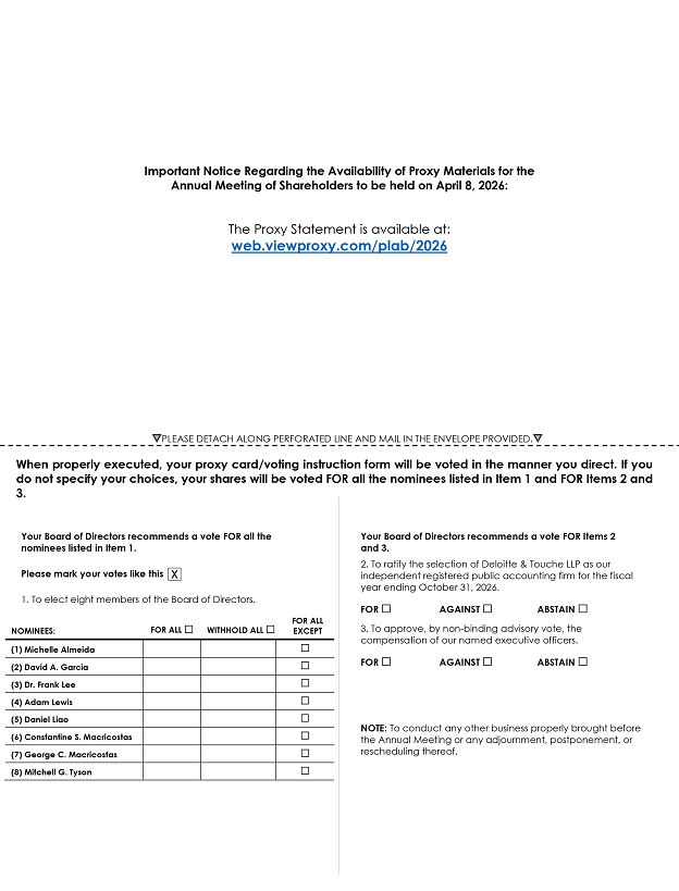 PLEASE DETACH ALONG PERFORATED LINE AND MAIL IN THE ENVELOPE PROVIDED. Important Notice Regarding the Availability of Proxy Materials for the Annual Meeting of Shareholders to be held on April 8, 2026: The Proxy Statement is available at: web.viewproxy.com/plab/2026 When properly executed, your proxy card/voting instruction form will be voted in the manner you direct. If you do not specify your choices, your shares will be voted FOR all the nominees listed in Item 1 and FOR Items 2 and 3. Your Board of Directors recommends a vote FOR all the nominees listed in Item 1. Please mark your votes like this 1. To elect eight members of the Board of Directors. NOMINEES: FOR ALL . WITHHOLD ALL . FOR ALL EXCEPT (1) Michelle Almeida . (2) David A. Garcia . (3) Dr. Frank Lee . (4) Adam Lewis . (5) Daniel Liao . (6) Constantine S. Macricostas . (7) George C. Macricostas . (8) Mitchell G. Tyson . Your Board of Directors recommends a vote FOR Items 2 and 3. 2. To ratify the selection of Deloitte & Touche LLP as our independent registered public accounting firm for the fiscal year ending October 31, 2026. FOR . AGAINST . ABSTAIN . 3. To approve, by non-binding advisory vote, the compensation of our named executive officers. FOR . AGAINST . ABSTAIN . NOTE: To conduct any other business properly brought before the Annual Meeting or any adjournment, postponement, or rescheduling thereof.