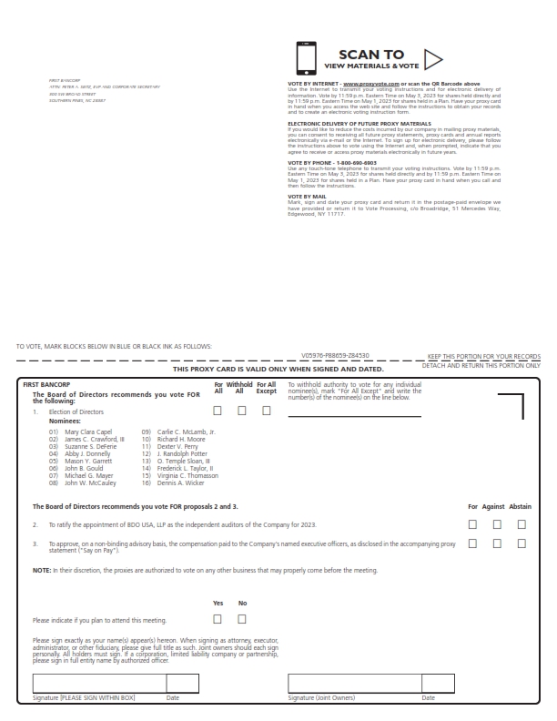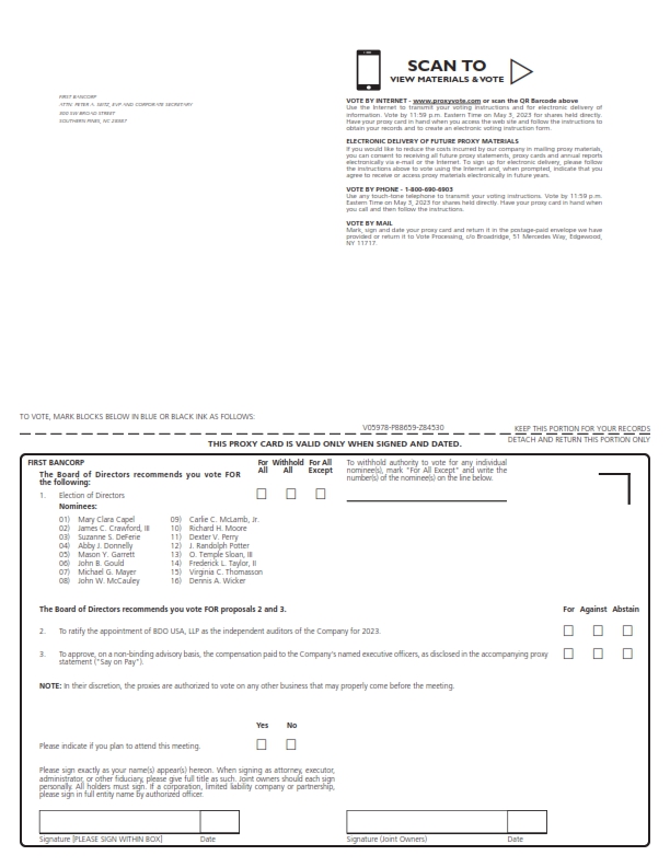 Important Notice Regarding the Availability of Proxy Materials for the Annual Meeting: The Notice and Proxy Statement and Annual Report on Form 10-K are available at www.proxyvote.com. V05977-P88659-Z84530 REVOCABLE PROXY FIRST BANCORP Annual Meeting of Shareholders May 4, 2023 1:30 PM ET This proxy is solicited by the Board of Directors The undersigned hereby appoints Richard H. Moore and Elizabeth B. Bostian, and each of them, attorneys and proxies with full power of substitution, to act and vote as designated below the shares of common stock of First Bancorp held of record by the undersigned on March 10, 2023, at the Annual Meeting of Shareholders to be held on May 4, 2023, or any adjournment thereof. This proxy, when properly executed, will be voted in the manner directed herein. If no such direction is made, this proxy will be voted "FOR" all nominees listed in PROPOSAL 1, "FOR" PROPOSAL 2, and "FOR" PROPOSAL 3. If, at or before the time of the meeting, any of the nominees listed has become unavailable for any reason, the proxies have the discretion to vote for a substitute nominee or nominees. Continued and to be signed on reverse side SCAN TO VIEW MATERIALS & VOTE FIRST BANCORP ATTN: PETER A. SEITZ, EVP AND CORPORATE SECRETARY 300 SW BROAD STREET SOUTHERN PINES, NC 28387 VOTE BY INTERNET - www.proxyvote.com or scan the QR Barcode above Use the Internet to transmit your voting instructions and for electronic delivery of information. Vote by 11:59 p.m. Eastern Time on May 3, 2023 for shares held directly. Have your proxy card in hand when you access the web site and follow the instructions to obtain your records and to create an electronic voting instruction form. ELECTRONIC DELIVERY OF FUTURE PROXY MATERIALS If you would like to reduce the costs incurred by our company in mailing proxy materials, you can consent to receiving all future proxy statements, proxy cards and annual reports electronically via e-mail or the Internet. To sign up for electronic delivery, please follow the instructions above to vote using the Internet and, when prompted, indicate that you agree to receive or access proxy materials electronically in future years. VOTE BY PHONE - 1-800-690-6903 Use any touch-tone telephone to transmit your voting instructions. Vote by 11:59 p.m. Eastern Time on May 3, 2023 for shares held directly. Have your proxy card in hand when you call and then follow the instructions. VOTE BY MAIL Mark, sign and date your proxy card and return it in the postage-paid envelope we have provided or return it to Vote Processing, c/o Broadridge, 51 Mercedes Way, Edgewood, NY 11717. TO VOTE, MARK BLOCKS BELOW IN BLUE OR BLACK INK AS FOLLOWS: V05978-P88659-Z84530 KEEP THIS PORTION FOR YOUR RECORDS THIS PROXY CARD IS VALID ONLY WHEN SIGNED AND DATED. DETACH AND RETURN THIS PORTION ONLY FIRST BANCORP For Withhold For All To withhold authority to vote for any individual The Board of Directors recommends you vote FOR the following: All All Except nominee(s), mark "For All Except" and write the number(s) of the nominee(s) on the line below. 1. Election of Directors Nominees: 01) Mary Clara Capel 02) James C. Crawford, III 03) Suzanne S. DeFerie 04) Abby J. Donnelly 05) Mason Y. Garrett 06) John B. Gould 07) Michael G. Mayer 08) John W. McCauley ! ! ! 09) Carlie C. McLamb, Jr. 10) Richard H. Moore 11) Dexter V. Perry 12) J. Randolph Potter 13) O. Temple Sloan, III 14) Frederick L. Taylor, II 15) Virginia C. Thomasson 16) Dennis A. Wicker The Board of Directors recommends you vote FOR proposals 2 and 3. For Against Abstain 2. To ratify the appointment of BDO USA, LLP as the independent auditors of the Company for 2023. ! ! ! 3. To approve, on a non-binding advisory basis, the compensation paid to the Company's named executive officers, as disclosed in the accompanying proxy ! ! ! statement ("Say on Pay"). NOTE: In their discretion, the proxies are authorized to vote on any other business that may properly come before the meeting. Yes No Please indicate if you plan to attend this meeting. ! ! Please sign exactly as your name(s) appear(s) hereon. When signing as attorney, executor, administrator, or other fiduciary, please give full title as such. Joint owners should each sign personally. All holders must sign. If a corporation, limited liability company or partnership, please sign in full entity name by authorized officer. Signature [PLEASE SIGN WITHIN BOX] Date Signature (Joint Owners) Date Important Notice Regarding the Availability of Proxy Materials for the Annual Meeting: The Notice and Proxy Statement and Annual Report on Form 10-K are available at www.proxyvote.com. V05979-P88659-Z84530