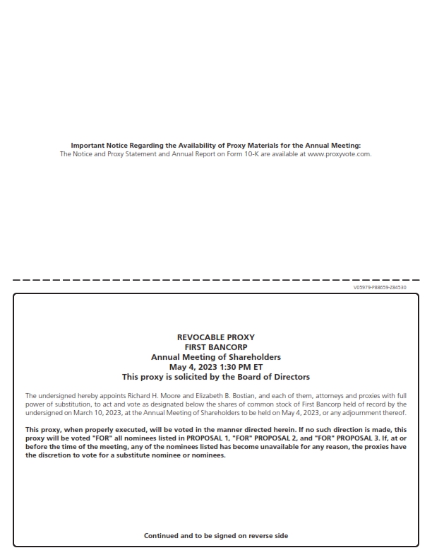 REVOCABLE PROXY FIRST BANCORP Annual Meeting of Shareholders May 4, 2023 1:30 PM ET This proxy is solicited by the Board of Directors The undersigned hereby appoints Richard H. Moore and Elizabeth B. Bostian, and each of them, attorneys and proxies with full power of substitution, to act and vote as designated below the shares of common stock of First Bancorp held of record by the undersigned on March 10, 2023, at the Annual Meeting of Shareholders to be held on May 4, 2023, or any adjournment thereof. This proxy, when properly executed, will be voted in the manner directed herein. If no such direction is made, this proxy will be voted "FOR" all nominees listed in PROPOSAL 1, "FOR" PROPOSAL 2, and "FOR" PROPOSAL 3. If, at or before the time of the meeting, any of the nominees listed has become unavailable for any reason, the proxies have the discretion to vote for a substitute nominee or nominees. Continued and to be signed on reverse side