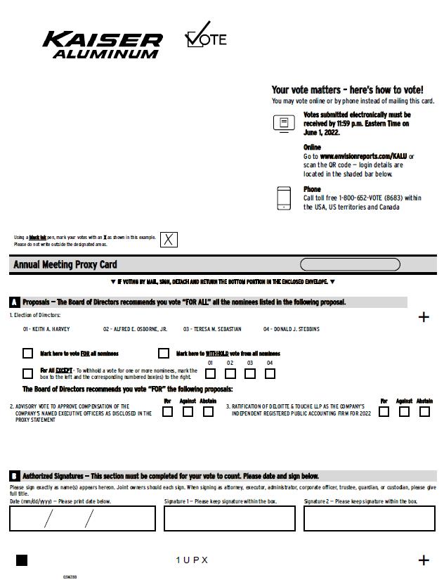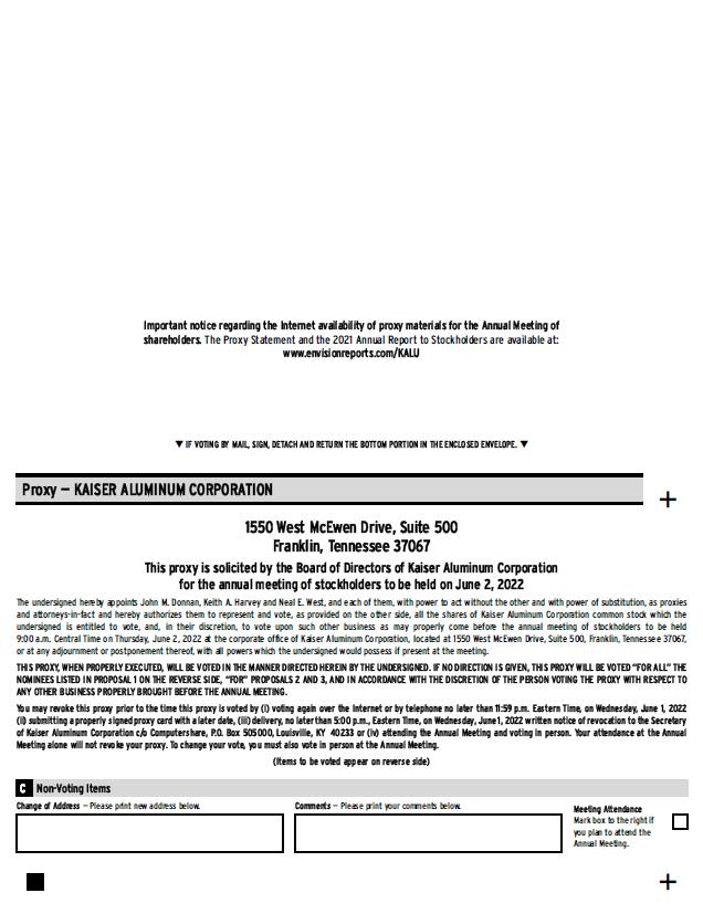 On behalf of our Board of Directors and management team, thank you for your continued support of Kaiser Aluminum. It is our pleasure to invite you to attend the Annual Meeting of Kaiser Aluminum Corporation to be held at our corporate office, located at 1550 West McEwen Drive, Suite 500, Franklin, Tennessee, on Thursday, June 2, 2022, at 9:00 a.m. Central. While we do not expect to make a separate presentation, we expect our directors and officers to be present at the Annual Meeting and available to respond to any questions you may have.