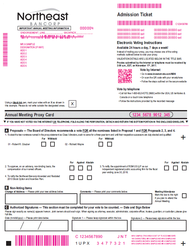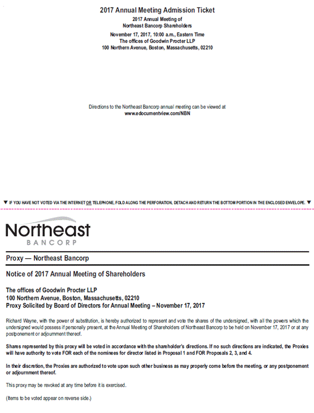 You are cordially invited to attend the 2017 annual meeting of shareholders of Northeast Bancorp. The annual meeting will be held on Friday, November 17, 2017 at 10:00 a.m., Eastern time, at the offices of Goodwin Procter LLP located at 100 Northern Avenue, Boston, Massachusetts 02210.