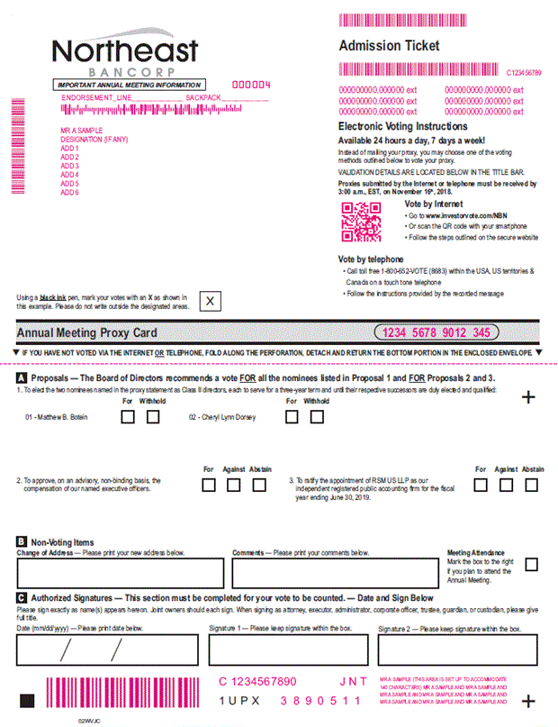 This proxy statement is being first made available to shareholders of Northeast Bancorp on or about October 4, 2018, and is being furnished in connection with the solicitation of proxies by the Board of Directors of Northeast Bancorp (the “Board”) for use at the 2018 annual meeting of shareholders of Northeast Bancorp to be held on Friday, November 16, 2018 at 10:00 a.m., Eastern time, at the offices of Goodwin Procter LLP located at 100 Northern Avenue, Boston, Massachusetts 02210, and at any adjournments or postponements thereof. For directions to attend the annual meeting, please visit http://www.edocumentview.com/NBN.