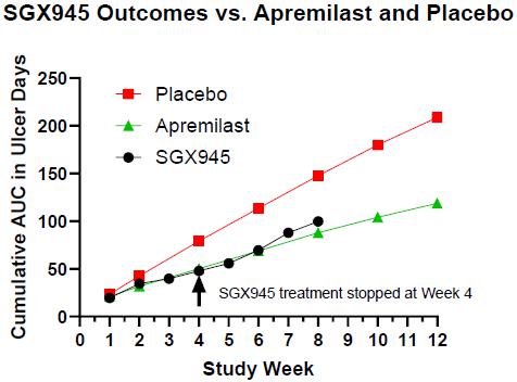 The primary endpoint in the Phase 3 apremilast study was the AUC of the mean number of ulcers versus time. Using this same endpoint after 4 weeks of treatment, the SGX945 treated group had a 40% improvement relative to the placebo group from the Phase 3 apremilast study, whereas apremilast had a 37% improvement relative to placebo. This improvement was sustained throughout the 4-week follow-up after treatment with SGX945, with 32% improvement evaluated at Week 8 despite treatment having stopped at Week 4. In contrast, apremilast, which was continuously administered through Week 12, had a 41% improvement at Week 8.
